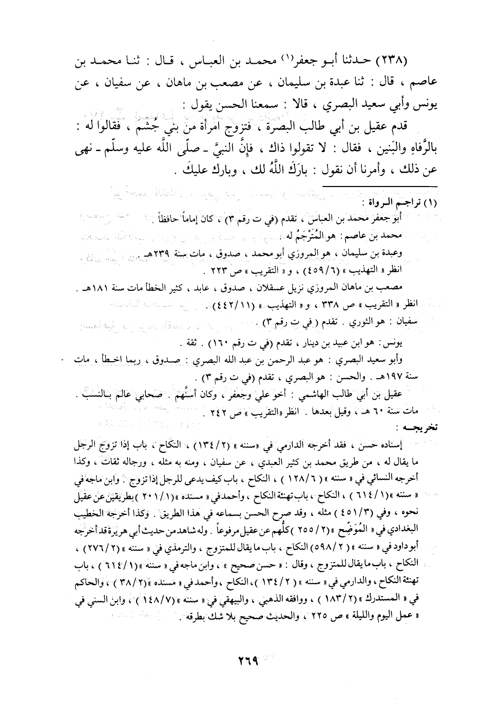 حَدَّثَنَا أَبُو جَعْفَرٍ مُحَمَّدُ بْنُ الْعَبَّاسِ , قَالَ: ثنا مُحَمَّدُ بْنُ عَاصِمٍ , قَالَ: ثنا عَبْدَةُ بْنُ سُلَيْمَانَ , عَنْ مُصْعَبِ بْنِ مَاهَانَ , عَنْ سُفْيَانَ , عَنْ يُونُسَ , وَأَبِي سَعِيدٍ الْبَصْرِيِّ قَالَا: سَمِعْنَا الْحَسَنَ , يَقُولُ: قَدِمَ عَقِيلُ بْنُ أَبِي طَالِبٍ الْبَصْرَةَ , فَتَزَوَّجَ امْرَأَةً مِنْ بَنِي جُشَمَ , فَقَالُوا لَهُ: بِالرَّفَاهِ وَالْبَنِينَ , فَقَالَ: لَا تَقُولُوا ذَاكَ , فَإِنَّ النَّبِيَّ صَلَّى اللهُ عَلَيْهِ وَسَلَّمَ " §نَهَى عَنْ ذَلِكَ , وَأَمَرَنَا أَنْ نَقُولَ: «بَارَكَ اللَّهُ لَكَ , وَبَارَكَ عَلَيْكَ»