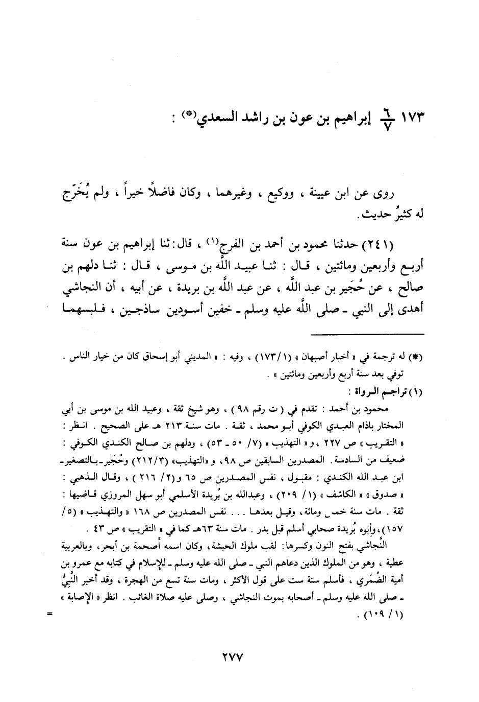 §173 - إِبْرَاهِيمُ بْنُ عَوْنِ بْنِ رَاشِدٍ السَّعْدِيُّ رَوَى عَنِ ابْنِ عُيَيْنَةَ , وَوَكِيعٍ , وَغَيْرِهِمَا , وَكَانَ فَاضِلًا خَيِّرًا , وَلَمْ يُخَرَّجْ لَهُ كَثِيرُ حَدِيثٍ