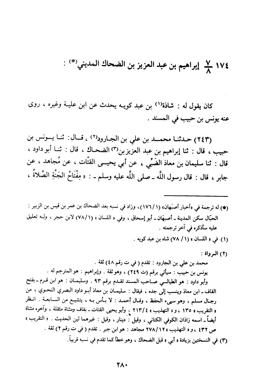 §174 - إِبْرَاهِيمُ بْنُ عَبْدِ الْعَزِيزِ بْنِ الضَّحَّاكِ الْمَدِينِيُّ كَانَ يَقُولُ لَهُ: شَاذَّةُ بْنُ عَبْدِ كُوَيْهَ يُحَدِّثُ عَنِ ابْنِ عُلَيَّةَ , وَغَيْرِهِ , رَوَى عَنْهُ يُونُسُ بْنُ حَبِيبٍ فِي الْمُسْنَدِ