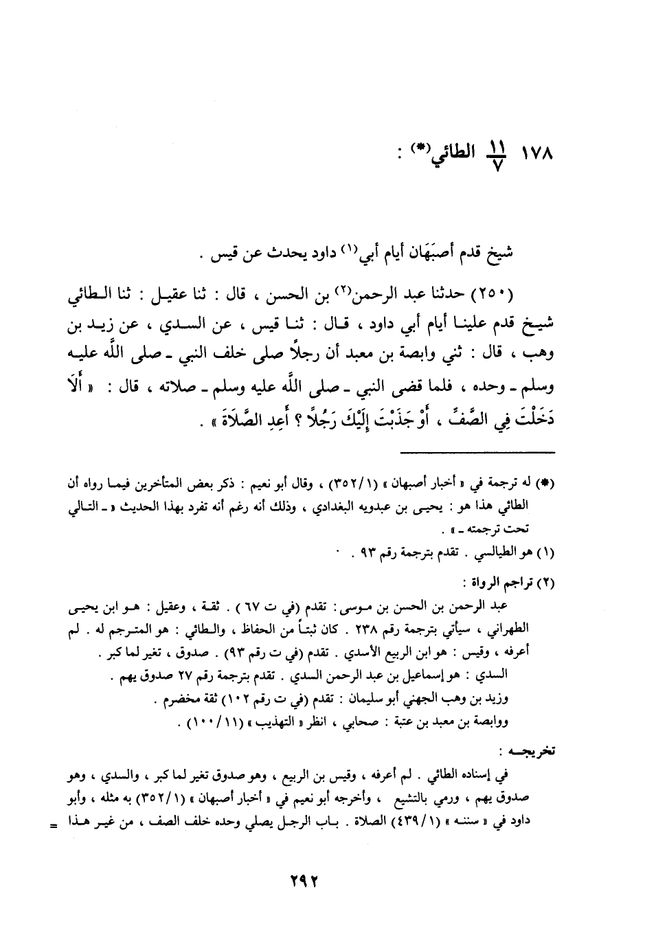حَدَّثَنَا عَبْدُ الرَّحْمَنِ بْنُ الْحَسَنِ , قَالَ: ثنا عَقِيلٌ، ثنا الطَّائِيُّ , شَيْخٌ قَدِمَ عَلَيْنَا أَيَّامَ أَبِي دَاوُدَ , قَالَ: ثنا قَيْسٌ، عَنِ السُّدِّيِّ , عَنْ زَيْدِ بْنِ وَهْبٍ , قَالَ: ثني وَابِصَةُ بْنُ مَعْبَدٍ , أَنَّ رَجُلا , صَلَّى خَلْفَ النَّبِيِّ صَلَّى اللهُ عَلَيْهِ وَسَلَّمَ وَحْدَهُ , فَلَمَّا قَضَى النَّبِيُّ صَلَّى اللهُ عَلَيْهِ وَسَلَّمَ صَلاتَهُ، قَالَ: «§أَلا دَخَلْتَ فِي الصَّفِّ , أَوْ جَذَبْتَ إِلَيْكَ رَجُلا أَعِدِ الصَّلاةَ»