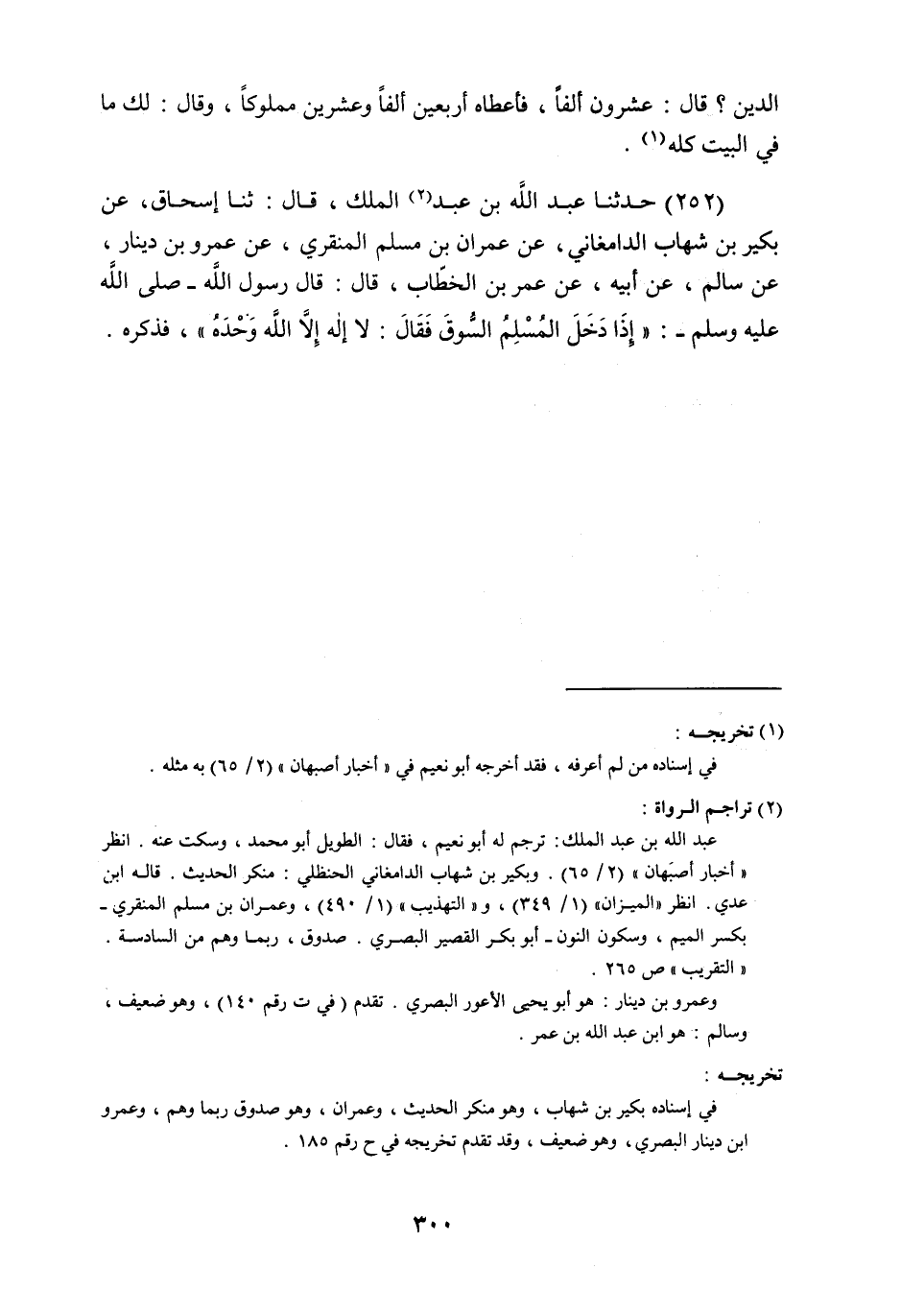 حَدَّثَنَا عَبْدُ اللَّهِ بْنُ عَبْدِ الْمَلِكِ , قَالَ: ثنا إِسْحَاقُ، عَنْ بُكَيْرِ بْنِ شِهَابٍ الدَّامِغَانِيِّ , عَنْ عِمْرَانَ بْنِ مُسْلِمٍ الْمُنَقِرِّيِّ , عَنْ عَمْرِو بْنِ دِينَارٍ , عَنْ سَالِمٍ , عَنْ أَبِيهِ , عَنْ عُمَرَ بْنِ الْخَطَّابِ , قَالَ: قَالَ رَسُولُ اللَّهِ صَلَّى اللهُ عَلَيْهِ وَسَلَّمَ: " §إِذَا دَخَلَ الْمُسْلِمُ السُّوقَ، فَقَالَ: لا إِلَهَ إِلا اللَّهُ , وَحْدَهُ "، فَذَكَرَهُ