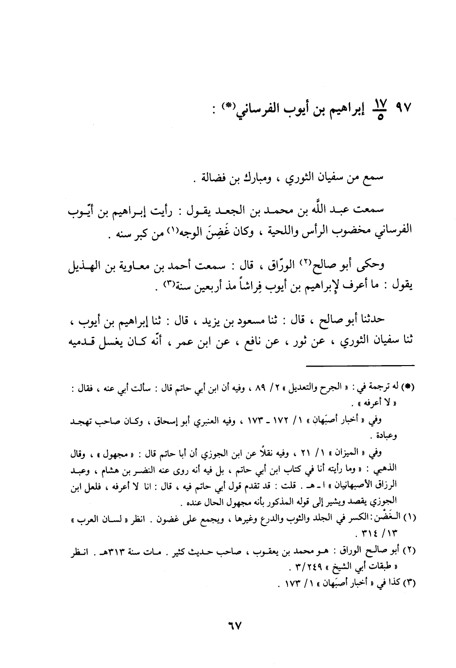§97 - إِبْرَاهِيمُ بْنُ أَيُّوبَ الْفِرْسَانِيُّ سَمِعَ مِنَ سُفْيَانَ الثَّوْرِيِّ , وَمُبَارَكِ بْنِ فَضَالَةَ سَمِعْتُ عَبْدَ اللَّهِ بْنَ مُحَمَّدِ بْنِ الْجَعْدِ يَقُولُ: «رَأَيْتُ إِبْرَاهِيمَ بْنَ أَيُّوبَ الْفِرْسَانِيَّ مَخْضُوبَ الرَّأْسِ وَاللِّحْيَةِ , وَكَانَ غَضِنَ الْوَجْهِ مِنْ كِبَرِ سِنِّهِ» وَحَكَى أَبُو صَالِحٍ الْوَرَّاقُ قَالَ: سَمِعْتُ أَحْمَدَ بْنَ مُعَاوِيَةَ بْنِ الْهُذَيْلِ يَقُولُ: مَا أَعْرِفُ لِإِبْرَاهِيمَ بْنِ أَيُّوبَ فِرَاشًا مُذْ أَرْبَعِينَ سَنَةً