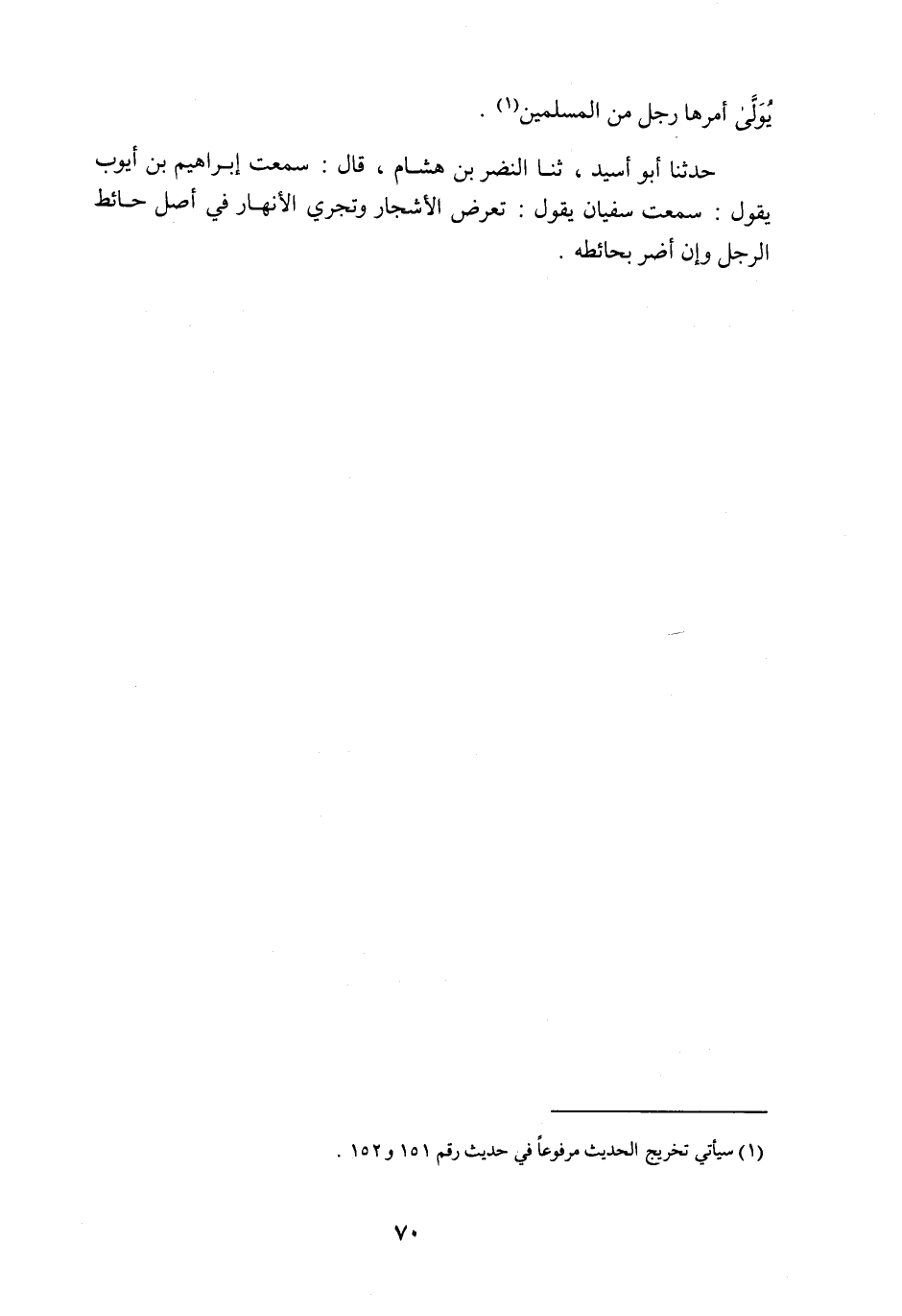 حَدَّثَنَا أَبُو أُسَيْدٍ , ثنا النَّضْرُ بْنُ هِشَامٍ , قَالَ: سَمِعْتُ إِبْرَاهِيمَ بْنَ أَيُّوبَ , يَقُولُ: سَمِعْتُ سُفْيَانَ , يَقُولُ: §«تَعْرِضُ الْأَشْجَارُ وَتَجْرِي الْأَنْهَارُ فِي أَصْلِ حَائِطِ الرَّجُلِ , وَإِنْ أَضَرَّ بِحَائِطِهِ»