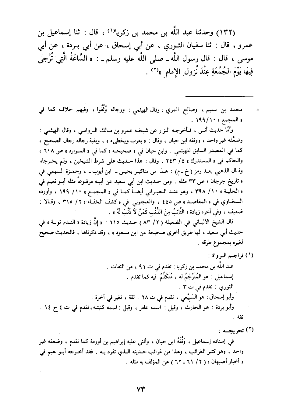 وَحَدَّثَنَا عَبْدُ اللَّهِ بْنُ مُحَمَّدِ بْنِ زَكَرِيَّا , قَالَ: ثنا إِسْمَاعِيلُ بْنُ عَمْرٍو , قَالَ: ثنا سُفْيَانُ الثَّوْرِيُّ , عَنْ أَبِي إِسْحَاقَ , عَنْ أَبِي بُرْدَةَ , عَنْ أَبِي مُوسَى , قَالَ: قَالَ رَسُولُ اللَّهِ صَلَّى اللهُ عَلَيْهِ وَسَلَّمَ: §«السَّاعَةُ الَّتِي تُرْجَى فِيهَا يَوْمَ الْجُمُعَةِ عِنْدَ نُزُولِ الْإِمَامِ»