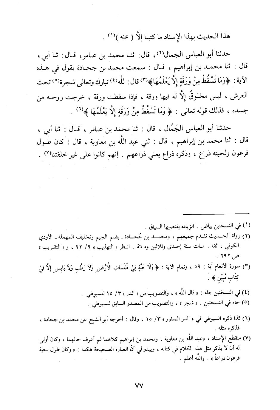 حَدَّثَنَا أَبُو الْعَبَّاسِ الْجَمَّالُ , قَالَ: ثنا مُحَمَّدُ بْنُ عَامِرٍ , قَالَ: ثنا أَبِي , قَالَ: ثنا مُحَمَّدُ بْنُ إِبْرَاهِيمَ , قَالَ: سَمِعْتُ مُحَمَّدَ بْنَ جُحَادَةَ , يَقُولُ فِي هَذِهِ الْآيَةِ {§وَمَا تَسْقُطُ مِنْ وَرَقَةٍ إِلَّا يَعْلَمُهَا} [الأنعام: 59] , قَالَ: " لِلَّهِ تَبَارَكَ وَتَعَالَى شَجَرَةٌ تَحْتَ الْعَرْشِ , لَيْسَ مَخْلُوقٌ إِلَّا لَهُ فِيهَا وَرَقَةٌ , فَإِذَا سَقَطَتْ وَرَقَةٌ خَرَجَتْ رُوحُهُ مِنْ جَسَدِهِ , فَذَلِكَ قَوْلُهُ تَعَالَى {وَمَا تَسْقُطُ مِنْ وَرَقَةٍ إِلَّا يَعْلَمُهَا} [الأنعام: 59] "