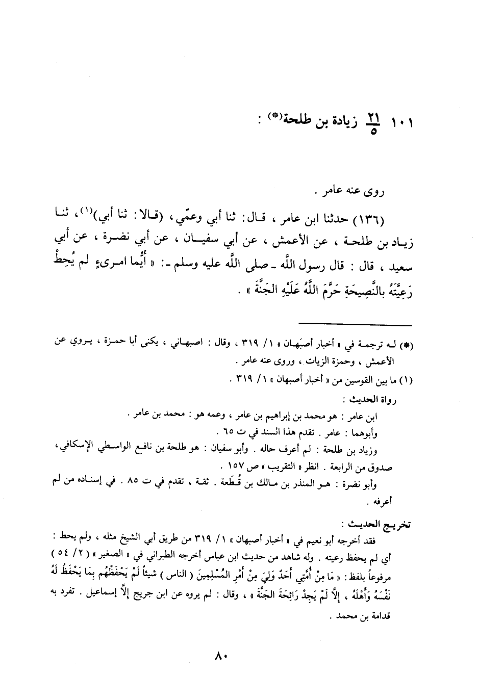 حَدَّثَنَا ابْنُ عَامِرٍ , قَالَ: ثنا أَبِي , وَعَمِّي , قَالَا: ثنا أَبِي , ثنا زِيَادُ بْنُ طَلْحَةَ , عَنِ الْأَعْمَشِ , عَنْ أَبِي سُفْيَانَ , عَنْ أَبِي نَضْرَةَ , عَنْ أَبِي سَعِيدٍ , قَالَ: قَالَ رَسُولُ اللَّهِ صَلَّى اللهُ عَلَيْهِ وَسَلَّمَ: §«أَيُّمَا امْرِئٍ لَمْ يَحُطْ رَعِيَّتَهُ بِالنَّصِيحَةِ حَرَّمَ اللَّهُ عَلَيْهِ الْجَنَّةَ»