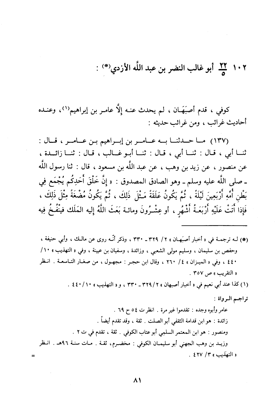 مَا حَدَّثَنَا بِهِ , عَامِرُ بْنُ إِبْرَاهِيمَ بْنِ عَامِرٍ , قَالَ: ثنا أَبِي , قَالَ: ثنا أَبِي , قَالَ: ثنا أَبُو غَالِبٍ , قَالَ: ثنا زَائِدَةُ , عَنْ مَنْصُورٍ , عَنْ زَيْدِ بْنِ وَهْبٍ , عَنْ عَبْدِ اللَّهِ بْنِ مَسْعُودٍ , قَالَ: ثنا رَسُولُ اللَّهِ صَلَّى اللهُ عَلَيْهِ وَسَلَّمَ , وَهُوَ الصَّادِقُ الْمَصْدُوقُ: " إِنَّ §خَلْقَ أَحَدِكُمْ يُجْمَعُ فِي بَطْنِ أُمِّهِ أَرْبَعِينَ لَيْلَةً , ثُمَّ يَكُونُ عَلَقَةً مِثْلَ ذَلِكَ , ثُمَّ يَكُونُ مُضْغَةً مِثْلَ ذَلِكَ , فَإِذَا أَتَتْ عَلَيْهِ أَرْبَعَةُ أَشْهُرٍ أَوْ عِشْرُونَ وَمِائَةٌ , بَعَثَ اللَّهُ إِلَيْهِ الْمَلَكَ فَيَنْفُخُ فِيهِ الرُّوحَ , فَيُقَالَ: اكْتُبْ أَجَلَهُ وَرِزْقَهُ , أَوْ شَقِيُّ أَوْ سَعِيدٌ , فَإِنَّ الرَّجُلَ لَيَعْمَلُ بِعَمَلِ أَهْلِ الْجَنَّةِ حَتَّى مَا يَكُونُ بَيْنَهُ وَبَيْنَهَا إِلَّا ذِرَاعٌ " فَذَكَرَ الْحَدِيثَ لَمْ يَذْكُرْ: عَنْ مَنْصُورٍ , غَيْرُهُ , وَقَدْ رَوَاهُ زَائِدَةُ , عَنِ الْأَعْمَشِ وَعِنْدَهُ أَحَادِيثُ يَتَفَرَّدُ بِهَا , وَقَدْ خَرَّجْتُهَا فِي فَوَائِدِ الْأَصْبَهَانِيِّينَ , وَهُوَ حَدَّثَنِي بِحَدِيثِ أَبِي غَالِبٍ النَّضْرِ , بِأَحَادِيثَ حَدَّثَ بِهَا إِسْمَاعِيلُ بْنُ عَمْرٍو سَوَاءً , لَا يُغَادِرُ مِنْهُ شَيْئًا , وَذَكَرَ أَنَّهُمَا كَانَا جَارَيْنِ بأَصْبَهَانَ , وَاللَّهُ أَعْلَمُ بِحَالِهِمَا , وَحَدَّثَ عَنْ سُفْيَانَ الثَّوْرِيِّ بِالْأَحَادِيثِ الَّتِي كَتَبْنَاهَا مِنْ إِسْمَاعِيلَ بْنِ عَمْرٍو , وَالْحَسَنِ بْنِ صَالِحٍ , فَلَمْ يُغَادِرْ مِنْهُ شَيْئًا , حَدَّثَ بِهِ عَامِرُ بْنُ إِبْرَاهِيمَ عَنْهُ