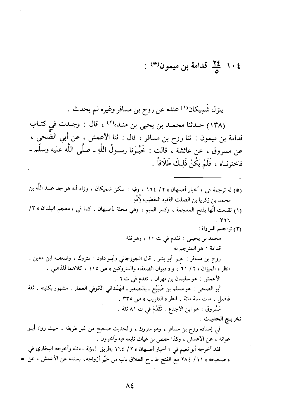 §104 - قُدَامَةُ بْنُ مَيْمُونٍ يَنْزِلُ شَمِيكَانَ عِنْدَهُ عَنْ رَوْحِ بْنِ مُسَافِرٍ وَغَيْرِهِ , لَمْ يُحَدِّثْ
