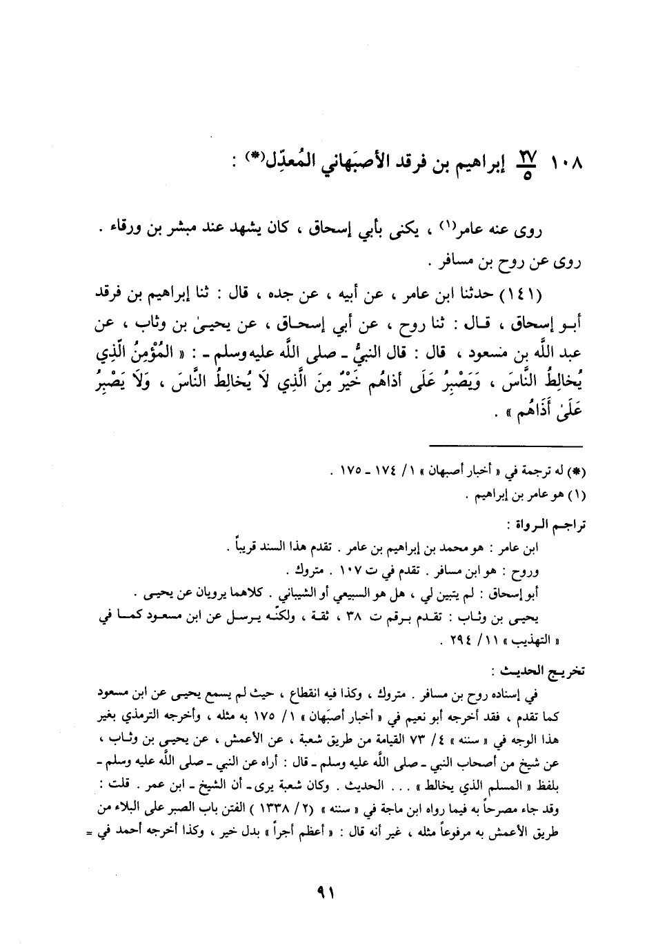 §108 - إِبْرَاهِيمُ بْنُ فَرْقَدٍ الْأَصْبَهَانِيُّ الْمُعَدِّلُ رَوَى عَنْهُ عَامِرٌ , يُكْنَى بِأَبِي إِسْحَاقَ , كَانَ يَشْهَدُ عِنْدَ مُبَشِّرِ بْنِ وَرْقَاءَ , رَوَى عَنْ رَوْحِ بْنِ مُسَافِرٍ