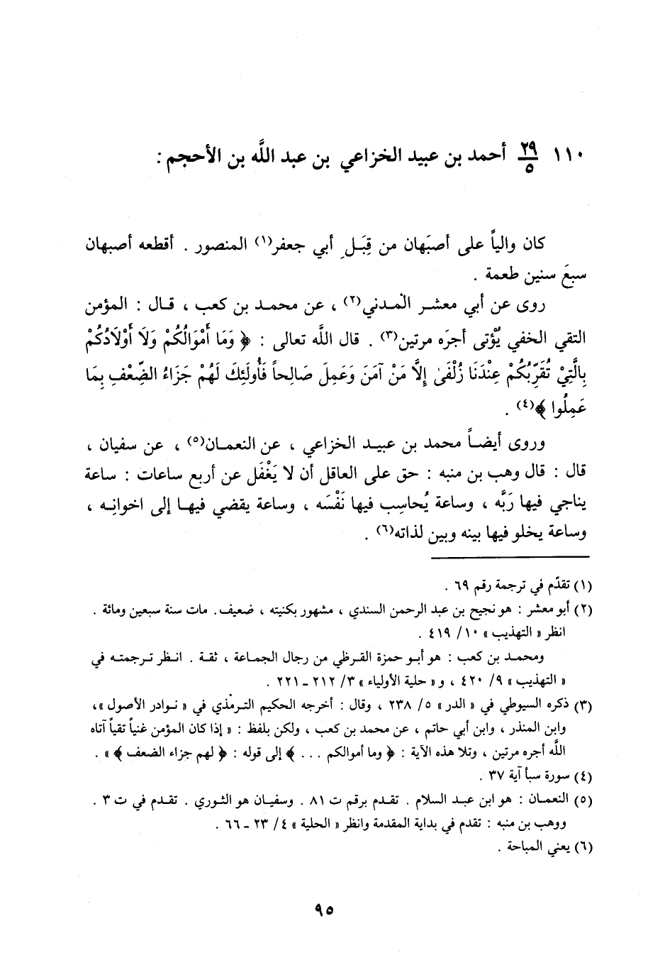 §110 - أَحْمَدُ بْنُ عُبَيْدٍ الْخُزَاعِيِّ بْنِ عَبْدِ اللَّهِ بْنِ الْأَحْجَمِ كَانَ وَالِيًا عَلَى أَصْبَهَانَ مِنْ قِبَلِ أَبِي جَعْفَرٍ الْمَنْصُورِ , أَقْطَعَهُ أَصْبَهَانَ سَبْعَ سِنِينَ طُعْمَةً