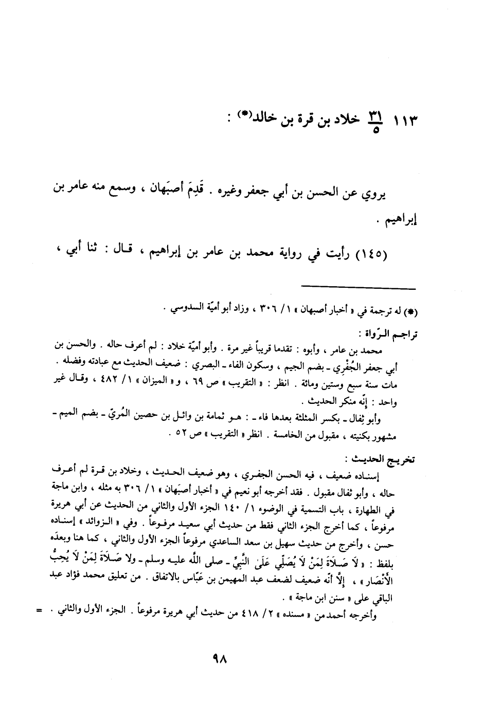 §113 - خَلَّادُ بْنُ قُرَّةَ بْنِ خَالِدٍ يَرْوِي عَنِ الْحَسَنِ بْنِ أَبِي جَعْفَرٍ وَغَيْرِهِ , قَدِمَ أَصْبَهَانَ , وَسَمِعَ مِنْهُ عَامِرُ بْنُ إِبْرَاهِيمَ