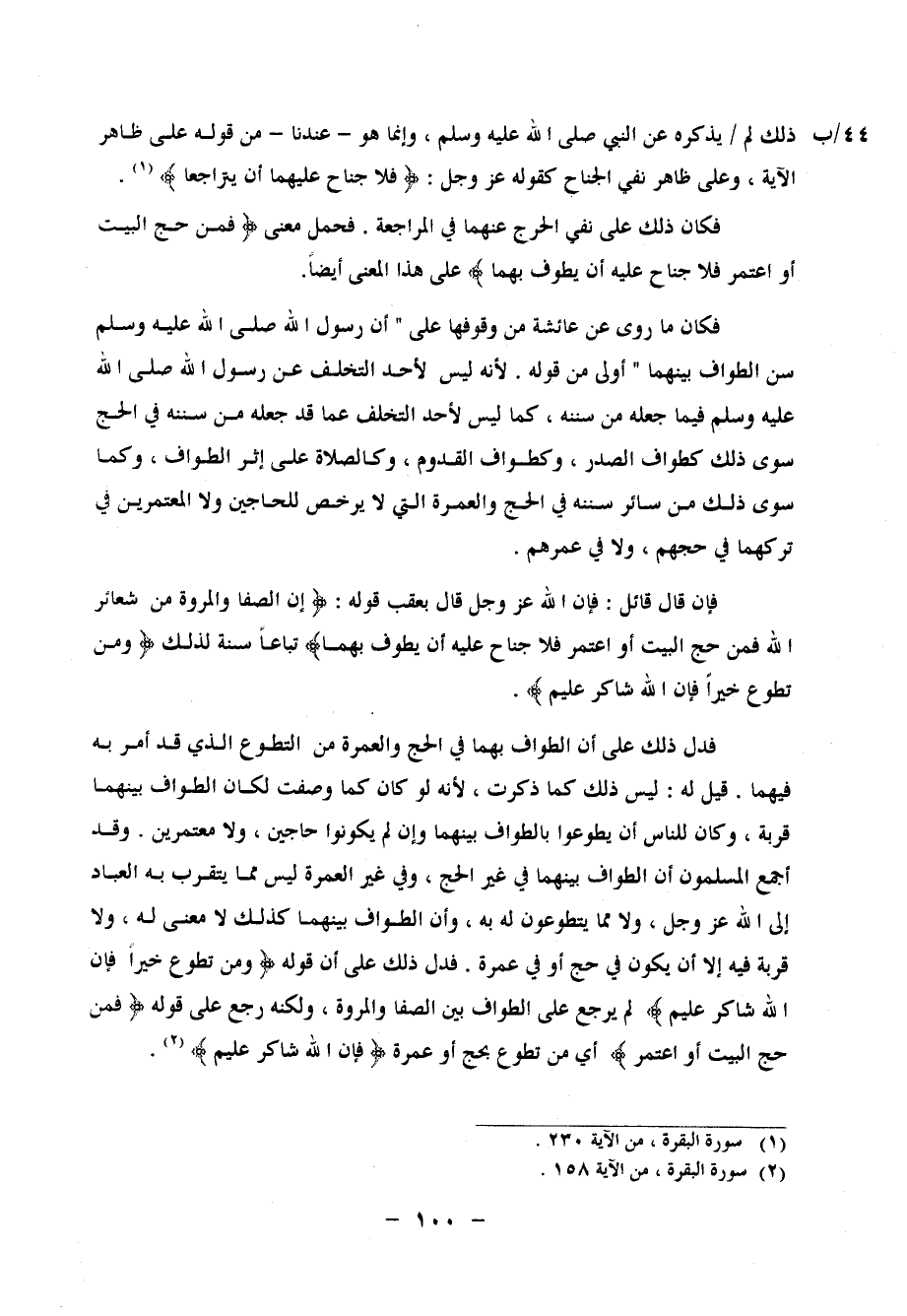 ذَلِكَ لَمْ يَذْكُرْهُ عَنِ النَّبِيِّ صَلَّى اللَّهُ عَلَيْهِ وَسَلَّمَ، وَإِنَّمَا هُوَ، عِنْدَنَا، مِنْ قَوْلِهِ عَلَى ظَاهِرِ الْآيَةِ، وَعَلى ظَاهِرِ نَفْيِ الْجُنَاحِ كَقَوْلِهِ عَزَّ وَجَلَّ: {فَلا جُنَاحَ عَلَيْهِمَا أَنْ يَتَرَاجَعَا} فَكَانَ ذَلِكَ عَلَى نَفْيِ الْحَرَجِ عَنْهُمَا فِي الْمُرَاجَعَةِ، فَحُمِلَ مَعْنَى: {فَمَنْ حَجَّ الْبَيْتَ أَوِ اعْتَمَرَ فَلا جُنَاحَ عَلَيْهِ أَنْ يَطَّوَّفَ بِهِمَا} ، عَلَى هَذَا الْمَعْنَى أَيْضًا فَكَانَ مَا رُوِيَ عَنْ عَائِشَةَ مِنْ وُقُوفِهَا عَلَى، أَنَّ رَسُولَ اللهِ صَلَّى اللَّهُ عَلَيْهِ وَسَلَّمَ سَنَّ الطَّوَافَ بَيْنَهُمَا، أَوْلَى مِنْ قَوْلِهِ، لِأَنَّهُ