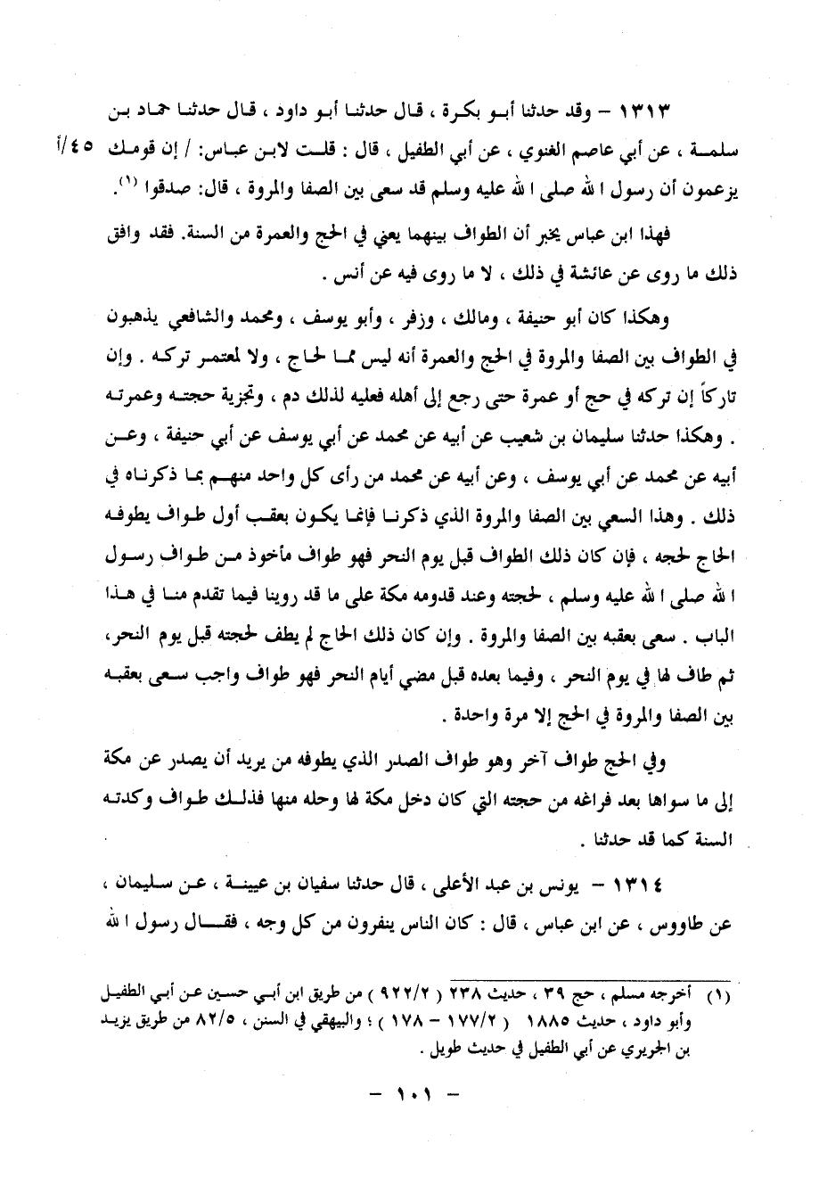 1313 - وَقَدْ حَدَّثَنَا أَبُو بَكْرَةَ، قَالَ: حَدَّثَنَا أَبُو دَاوُدَ، قَالَ: حَدَّثَنَا حَمَّادُ بْنُ سَلَمَةَ، عَنْ أَبِي عَاصِمٍ الْغَنَوِيِّ، عَنْ أَبِي الطُّفَيْلِ، قَالَ: قُلْتُ لِابْنِ عَبَّاسٍ: " إِنَّ قَوْمَكَ يَزْعُمُونَ أَنَّ رَسُولَ اللهِ صَلَّى اللَّهُ عَلَيْهِ وَسَلَّمَ قَدْ سَعَى بَيْنَ الصَّفَا وَالْمَرْوَةِ؟ قَالَ: صَدَقُوا " فَهَذَا ابْنُ عَبَّاسٍ يُخْبِرُ أَنَّ الطَّوَافَ بَيْنَهُمَا، يَعْنِي: فِي الْحَجِّ وَالْعُمْرَةِ مِنَ السُّنَّةِ، فَقَدْ وَافَقَ ذَلِكَ مَا رُوِيَ عَنْ عَائِشَةَ فِي ذَلِكَ، لَا مَا رُوِيَ فِيهِ عَنْ أَنَسٍ وَهَكَذَا كَانَ أَبُو حَنِيفَةَ، وَمَالِكٌ، وَزُفَرُ، وَأَبُو يُوسُفَ، وَمُحَمَّدٌ، وَالشَّافِعِيُّ يَذْهَبُونَ فِي الطَّوَافِ بَيْنَ الصَّفَا وَالْمَرْوَةِ فِي الْحَجِّ وَالْعُمْرَةِ، أَنَّهُ لَيْسَ مِمَّا لِحَاجٍّ، وَلَا لِمُعْتَمِرٍ تَرْكُهُ، وَأَنَّ تَارِكًا إِنْ تَرَكَهُ فِي حَجٍّ أَوْ عُمْرَةٍ حَتَّى رَجَعَ إِلَى أَهْلِهِ فَعَلَيْهِ لِذَلِكَ دَمٌ، وَتَجْزِيهِ حَجَّتُهُ وَعُمْرَتُهُ وَهَكَذَا حَدَّثَنَا سُلَيْمَانُ بْنُ شُعَيْبٍ، عَنْ أَبِيهِ، عَنْ مُحَمَّدٍ، عَنْ أَبِي يُوسُفَ، عَنْ أَبِي حَنِيفَةَ، وَعَنْ أَبِيهِ، عَنْ مُحَمَّدٍ، عَنْ أَبِي يُوسُفَ، وَعَنْ أَبِيهِ، عَنْ مُحَمَّدٍ مِنْ رَأْيِ كُلِّ وَاحِدٍ مِنْهُمْ بِمَا ذَكَرْنَاهُ فِي ذَلِكَ وَهَذَا السَّعْيُ بَيْنَ الصَّفَا وَالْمَرْوَةِ الَّذِي ذَكَرْنَا فَإِنَّمَا يَكُونُ بِعَقِبِ أَوَّلِ طَوَافٍ يَطُوفُهُ الْحَاجُّ لِحَجِّهِ، فَإِنْ كَانَ ذَلِكَ الطَّوَافُ قَبْلَ يَوْمِ النَّحْرِ، فَهُوَ طَوَافٌ مَأْخُوذٌ مِنْ طَوَافِ رَسُولِ اللهِ صَلَّى اللَّهُ عَلَيْهِ وَسَلَّمَ لِحَجَّتِهِ وَعِنْدَ قُدُومِهِ مَكَّةَ عَلَى مَا قَدْ رُوِّينَا فِيمَا تَقَدَّمَ مِنَّا فِي هَذَا الْبَابِ، سَعَى بِعَقِبِهِ بَيْنَ الصَّفَا وَالْمَرْوَةِ وَإِنْ كَانَ