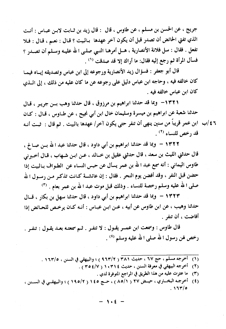1323 - وَبِمَا قَدْ حَدَّثَنَا إِبْرَاهِيمُ بْنُ أَبِي دَاوُدَ، قَالَ: حَدَّثَنَا سَهْلُ بْنُ بَكَّارٍ، قَالَ: حَدَّثَنَا وُهَيْبٌ، عَنِ ابْنِ طَاوُسٍ، عَنْ أَبِيهِ، عَنِ ابْنِ عَبَّاسٍ، " أَنَّهُ كَانَ يُرَخِّصُ لِلْحَائِضِ إِذَا أَفَاضَتْ أَنْ تَنْفِرَ " قَالَ طَاوُسٌ: وَسَمِعْتُ ابْنَ عُمَرَ، يَقُولُ: لَا تَنْفِرُ ثُمَّ سَمِعْتُهُ بَعْدُ يَقُولُ: " تَنْفِرُ، رَخَّصَ لَهُنَّ رَسُولُ اللهِ صَلَّى اللَّهُ عَلَيْهِ وَسَلَّمَ "