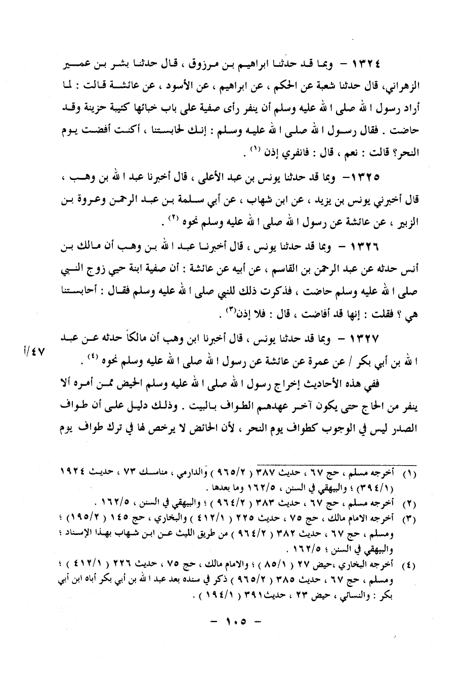 1326 - وَبِمَا قَدْ حَدَّثَنَا يُونُسُ، قَالَ: أَخْبَرَنَا عَبْدُ اللهِ بْنُ وَهْبٍ، أَنَّ مَالِكَ بْنَ أَنَسٍ، حَدَّثَهُ عَنْ عَبْدِ الرَّحْمَنِ بْنِ الْقَاسِمِ، عَنْ أَبِيهِ، عَنْ عَائِشَةَ، أَنَّ صَفِيَّةَ ابْنَةَ حَيِيٍّ زَوْجَ النَّبِيِّ صَلَّى اللَّهُ عَلَيْهِ وَسَلَّمَ حَاضَتْ، فَذَكَرَتْ ذَلِكَ لِلنَّبِيِّ صَلَّى اللَّهُ عَلَيْهِ وَسَلَّمَ، فَقَالَ: " أَحَابِسَتُنَا هِيَ؟ " فَقُلْتُ: إِنَّهَا قَدْ أَفَاضَتْ قَالَ: " فَلَا إِذَنْ "،