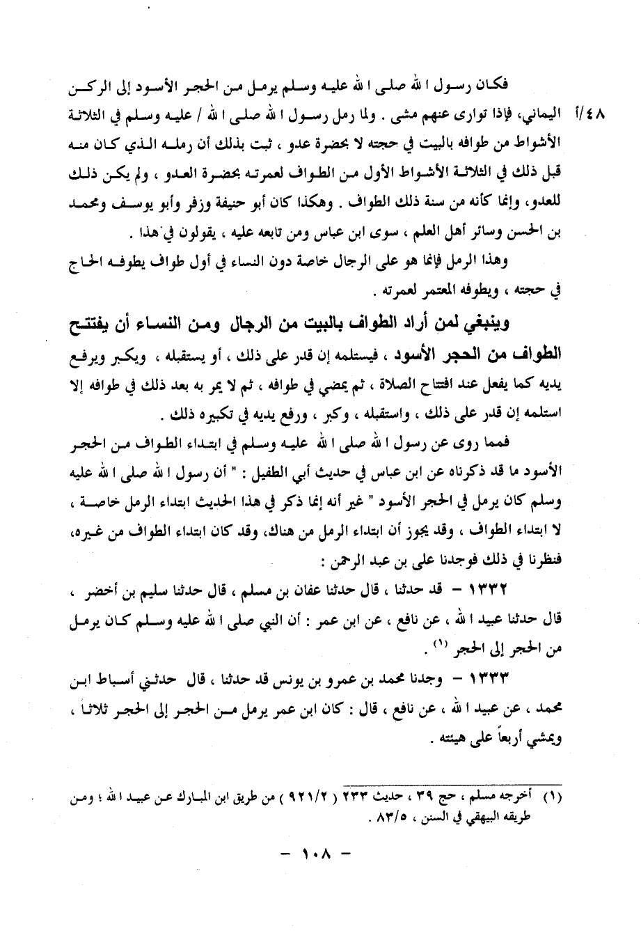 فَكَانَ رَسُولُ اللهِ صَلَّى اللَّهُ عَلَيْهِ وَسَلَّمَ يَرْمُلُ مِنَ الْحَجَرِ الْأَسْوَدِ إِلَى الرُّكْنِ الْيَمَانِيِّ، فَإِذَا تَوَارَى عَنْهُمْ مَشَى وَلَمَّا رَمَلَ رَسُولُ اللهِ صَلَّى اللَّهُ عَلَيْهِ وَسَلَّمَ فِي الثَّلَاثَةِ الْأَشْوَاطِ مِنْ طَوَافِهِ بِالْبَيْتِ فِي حَجَّتِهِ لَا بِحَضْرَةِ عَدُوٍّ، ثَبَتَ بِذَلِكَ أَنَّ رَمَلَهُ الَّذِي كَانَ مِنْهُ قَبْلَ ذَلِكَ فِي الثَّلَاثَةِ الْأَشْوَاطِ الْأُوَلِ مِنَ الطَّوَافِ لِعُمْرَتِهِ بِحَضْرَةِ الْعَدُوِّ، وَلَمْ يَكُنْ ذَلِكَ لِلْعَدُوِّ، وَإِنَّمَا كَأَنَّهُ مِنْ سُنَّةِ ذَلِكَ الطَّوَافِ وَهَكَذَا كَانَ أَبُو حَنِيفَةَ، وَزُفَرُ، وَأَبُو يُوسُفَ، وَمُحَمَّدُ بْنُ الْحَسَنِ، وَسَائِرُ أَهْلِ الْعِلْمِ، سِوَى ابْنِ عَبَّاسٍ وَمَنْ تَابَعَهُ عَلَيْهِ، يَقُولُونَ فِي هَذَا وَهَذَا الرَّمَلُ فَإِنَّمَا هُوَ عَلَى الرِّجَالِ خَاصَّةً دُونَ النِّسَاءِ فِي أَوَّلِ طَوَافٍ يَطُوفُهُ الْحَاجُّ فِي حَجَّتِهِ، وَيَطُوفُهُ الْمُعْتَمِرُ لِعُمْرَتِهِ وَيَنْبَغِي لِمَنْ أَرَادَ الطَّوَافَ بِالْبَيْتِ مِنَ الرِّجَالِ وَمِنَ النِّسَاءِ أَنْ يَفْتَتِحَ الطَّوَافَ مِنَ الْحَجَرِ الْأَسْوَدِ، فَيَسْتَلِمُهُ إِنْ قَدِرَ عَلَى ذَلِكَ، أَوْ يَسْتَقْبِلُهُ، وَيُكَبِّرُ، وَيَرْفَعُ يَدَيْهِ كَمَا يَفْعَلُ عِنْدَ افْتِتَاحِ الصَّلَاةِ، ثُمَّ يَمْضِي