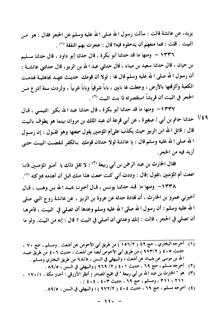 1337 - وَمِنْهَا مَا قَدْ حَدَّثَنَا أَبُو بَكْرَةَ، قَالَ: حَدَّثَنَا عَبْدُ اللهِ بُكَيْرُ التَّيْمِيُّ، قَالَ: حَدَّثَنَا حَاتِمُ بْنُ أَبِي صَغِيرَةَ، عَنْ أَبِي قَزَعَةَ، أَنَّ عَبْدَ الْمَلِكِ بْنَ مَرْوَانَ بَيْنَمَا هُوَ يَطُوفُ بِالْبَيْتِ، قَالَ: قَاتَلَ اللهُ ابْنَ الزُّبَيْرِ حَيْثُ يَكْذِبُ عَلَى أُمِّ الْمُؤْمِنِينَ، يَقُولُ: سَمِعْتُهَا وَهِيَ تَقُولُ: إِنَّ رَسُولَ اللهِ صَلَّى اللَّهُ عَلَيْهِ وَسَلَّمَ قَالَ: " يَا عَائِشَةُ، لَوْلَا حَدَثَانُ قَوْمِكِ بِالْكُفْرِ لَنَقَضْتُ الْبَيْتَ حَتَّى أُزِيدَ فِيهِ مِنَ الْحِجْرِ " فَقَالَ الْحَارِثُ بْنُ عَبْدِ الرَّحْمَنِ بْنِ أَبِي رَبِيعَةَ: لَا تَقُلْ ذَلِكَ يَا أَمِيرَ الْمُؤْمِنِينَ، فَأَنَا سَمِعْتُ أُمَّ الْمُؤْمِنِينَ، تَقُولُ قَالَ: وَدِدْتُ أَنِّي كُنْتُ سَمِعْتُ هَذَا مِنْكَ قَبْلَ أَنْ أَهْدِمَهُ فَتَرَكْتُهُ