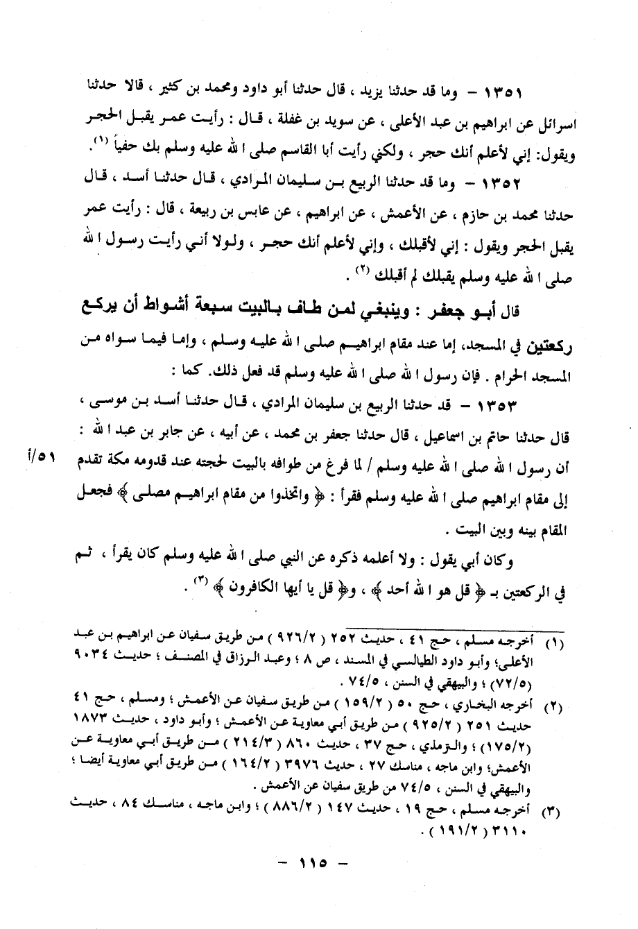 1352 - وَمَا قَدْ حَدَّثَنَا الرَّبِيعُ بْنُ سُلَيْمَانَ الْمُرَادِيُّ، قَالَ: حَدَّثَنَا أَسَدٌ، قَالَ: حَدَّثَنَا مُحَمَّدُ بْنُ حَازِمٍ، عَنِ الْأَعْمَشِ، عَنْ إِبْرَاهِيمَ، عَنْ عَابِسِ بْنِ رَبِيعَةَ، قَالَ: رَأَيْتُ عُمَرَ يُقَبِّلُ الْحَجَرَ، وَيَقُولُ: " إِنِّي لَأُقَبِّلُكَ، وَإِنِّي لَأَعْلَمُ أَنَّكَ حَجَرٌ، وَلَوْلَا أَنِّي رَأَيْتُ رَسُولَ اللهِ صَلَّى اللَّهُ عَلَيْهِ وَسَلَّمَ يُقَبِّلُكَ لَمْ أَقُبِّلْكَ " قَالَ أَبُو جَعْفَرٍ: وَيَنْبَغِي لِمَنْ طَافَ بِالْبَيْتِ سَبْعَةَ أَشْوَاطٍ أَنْ يَرْكَعَ رَكْعَتَيْنِ فِي الْمَسْجِدِ، إِمَّا عِنْدَ مَقَامِ إِبْرَاهِيمَ صَلَّى اللَّهُ عَلَيْهِ وَسَلَّمَ، وَإِمَّا فِيمَا سِوَاهُ مِنَ الْمَسْجِدِ الْحَرَامِ، فَإِنَّ رَسُولَ اللهِ صَلَّى اللَّهُ عَلَيْهِ وَسَلَّمَ قَدْ فَعَلَ ذَلِكَ كَمَا