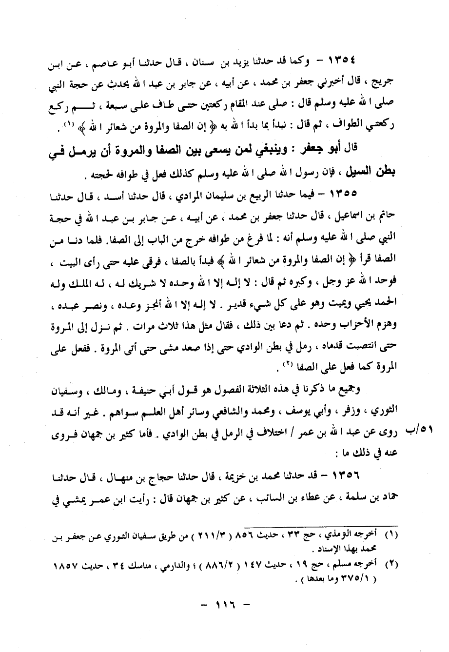 1355 - فِيمَا حَدَّثَنَا الرَّبِيعُ بْنُ سُلَيْمَانَ الْمُرَادِيُّ، قَالَ: حَدَّثَنَا أَسَدٌ، قَالَ: حَدَّثَنَا حَاتِمُ بْنُ إِسْمَاعِيلَ، قَالَ: حَدَّثَنَا جَعْفَرُ بْنُ مُحَمَّدٍ، عَنْ أَبِيهِ، عَنْ جَابِرِ بْنِ عَبْدِ اللهِ، فِي حَجَّةِ النَّبِيِّ صَلَّى اللَّهُ عَلَيْهِ وَسَلَّمَ، أَنَّهُ لَمَّا فَرَغَ مِنْ طَوَافِهِ خَرَجَ مِنَ الْبَابِ إِلَى الصَّفَا، فَلَمَّا دَنَا مِنَ الصَّفَا قَرَأَ: {إِنَّ الصَّفَا وَالْمَرْوَةَ مِنْ شَعَائِرِ اللهِ} ، فَبَدَأَ بِالصَّفَا، فَرَقَى عَلَيْهِ حَتَّى رَأَى الْبَيْتَ، فَوَحَّدَ اللهَ عَزَّ وَجَلَّ، وَكَبَّرَهُ، ثُمَّ قَالَ: " لَا إِلَهَ إِلَّا اللهُ وَحْدَهُ لَا شَرِيكَ لَهُ، لَهُ الْمُلْكُ وَلَهُ الْحَمْدُ، يُحْيِي وَيُمِيتُ وَهُوَ عَلَى كُلِّ شَيْءٍ قَدِيرٌ، لَا إِلَهَ إِلَّا اللهُ، أَنْجَزَ وَعْدَهُ، وَنَصَرَ عَبْدَهُ، وَهَزَمَ الْأَحْزَابَ وَحْدَهُ "، ثُمَّ دَعَا بَيْنَ ذَلِكَ، فَقَالَ مِثْلَ هَذَا ثَلَاثَ مَرَّاتٍ، ثُمَّ نَزَلَ إِلَى الْمَرْوَةِ حَتَّى انْتَصَبَتْ قَدَمَاهُ، رَمَلَ فِي بَطْنِ الْوَادِي حَتَّى إِذَا صَعَدَ مَشَى حَتَّى أَتَى الْمَرْوَةَ، فَفَعَلَ عَلَى الْمَرْوَةِ كَمَا فَعَلَ عَلَى الصَّفَا " وَجَمِيعُ مَا ذَكَرْنَا فِي هَذِهِ الثَّلَاثَةِ الْفُصُولِ هُوَ قَوْلُ أَبِي حَنِيفَةَ، وَمَالِكٍ، وَسُفْيَانَ الثَّوْرِيِّ، وَزُفَرَ، وَأَبِي يُوسُفَ، وَمُحَمَّدٍ، وَالشَّافِعِيِّ، وَسَائِرِ أَهْلِ الْعِلْمِ سِوَاهُمْ غَيْرَ أَنَّهُ قَدْ رُوِيَ عَنْ عَبْدِ اللهِ بْنِ عُمَرَ اخْتِلَافٌ فِي الرَّمَلِ فِي بَطْنِ الْوَادِي فَأَمَّا كَثِيرُ بْنُ جُهْمَانَ فَرُوِيَ عَنْهُ فِي ذَلِكَ مَا