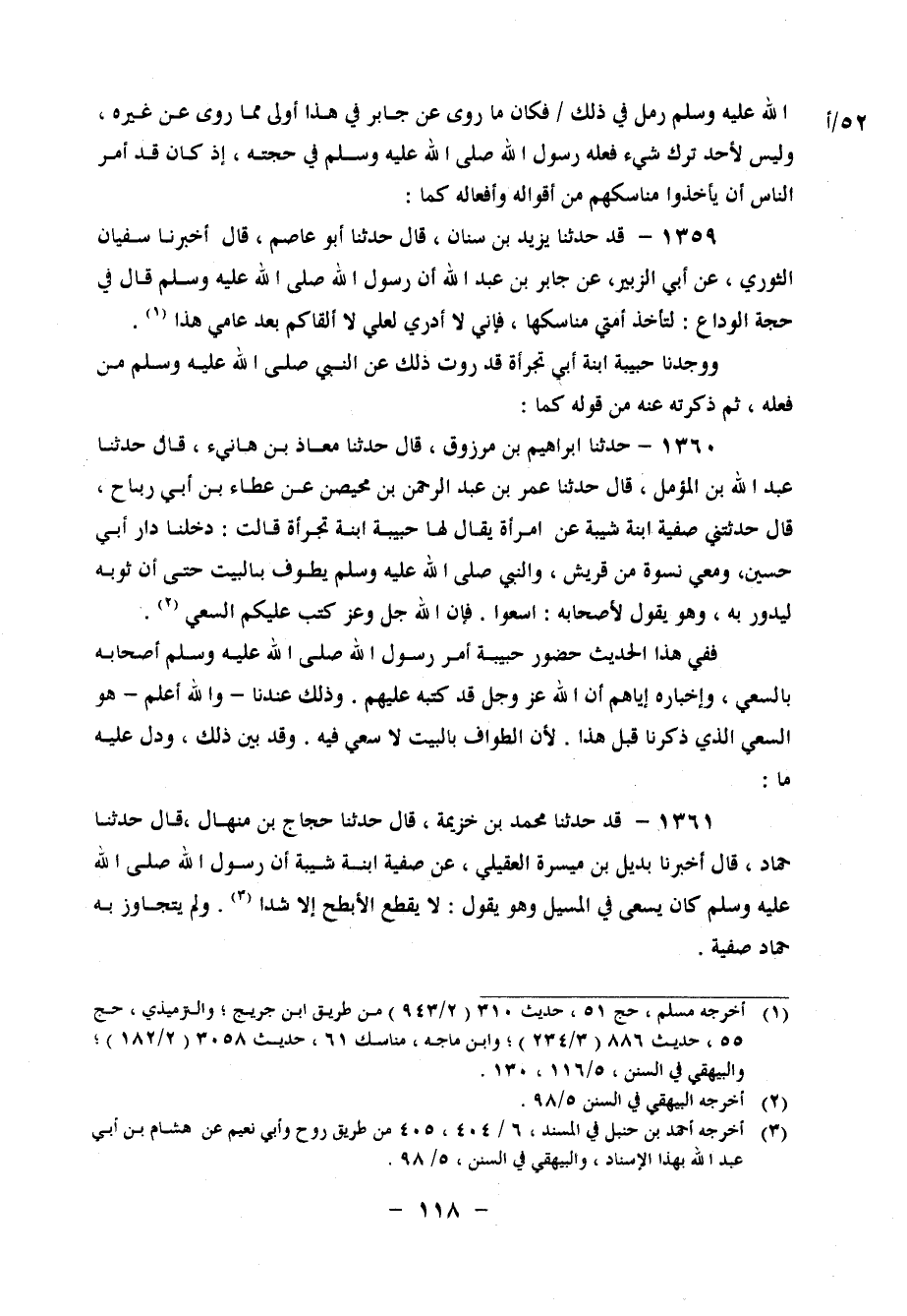 1361 - قَدْ حَدَّثَنَا مُحَمَّدُ بْنُ خُزَيْمَةَ، قَالَ: حَدَّثَنَا حَجَّاجُ بْنُ مِنْهَالٍ، قَالَ: حَدَّثَنَا حَمَّادٌ، قَالَ: أَخْبَرَنَا بُدَيْلُ بْنُ مَيْسَرَةَ الْعُقَيْلِيُّ، عَنْ صَفِيَّةَ ابْنَةِ شَيْبَةَ، أَنَّ رَسُولَ اللهِ صَلَّى اللَّهُ عَلَيْهِ وَسَلَّمَ كَانَ يَسْعَى فِي الْمَسِيلِ وَهُوَ يَقُولُ: " لَا يُقْطَعُ الْأَبْطَحُ إِلَّا شَدًّا "، وَلَمْ يَتَجَاوَزْ بِهِ حَمَّادٌ صَفِيَّةَ