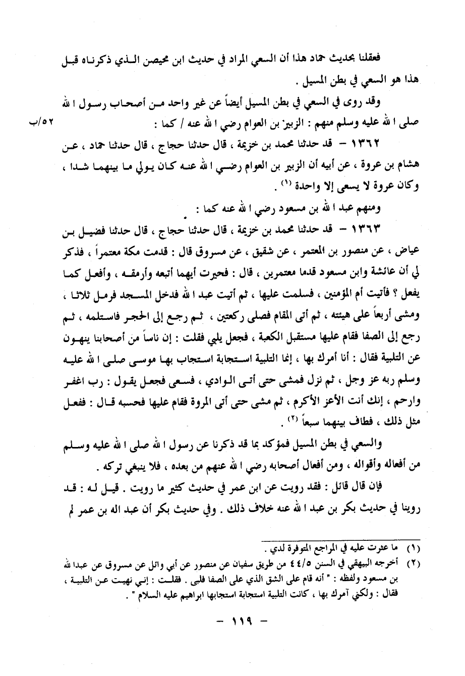 1362 - قَدْ حَدَّثَنَا مُحَمَّدُ بْنُ خُزَيْمَةَ، قَالَ: حَدَّثَنَا حَجَّاجٌ، قَالَ: حَدَّثَنَا حَمَّادٌ، عَنْ هِشَامِ بْنِ عُرْوَةَ، عَنْ أَبِيهِ، " أَنَّ الزُّبَيْرَ بْنَ الْعَوَّامِ رَضِيَ اللهُ عَنْهُ كَانَ يُوَلِّي مَا بَيْنَهُمَا شَدًّا، وَكَانَ عُرْوَةُ لَا يَسْعَى إِلَّا وَاحِدَةً " وَمِنْهُمْ عَبْدُ اللهِ بْنُ مَسْعُودٍ رَضِيَ اللهُ عَنْهُ كَمَا