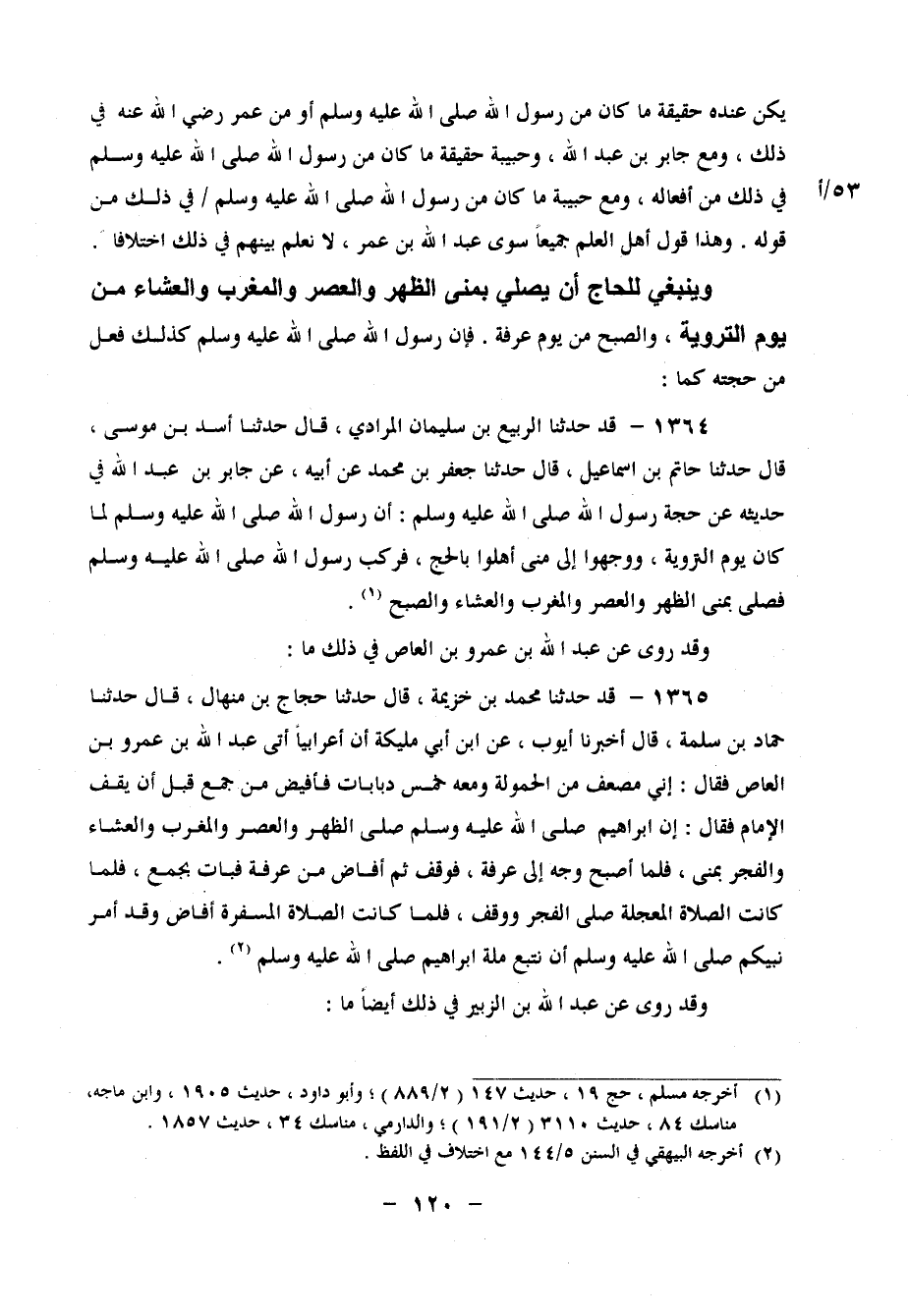 يَكُنْ عِنْدَهُ حَقِيقَةُ مَا كَانَ مِنْ رَسُولِ اللهِ صَلَّى اللَّهُ عَلَيْهِ وَسَلَّمَ أَوْ مِنْ عُمَرَ رَضِيَ اللهُ عَنْهُ فِي ذَلِكَ، وَمَعَ جَابِرِ بْنِ عَبْدِ اللهِ، وَحَبِيبَةَ حَقِيقَةُ مَا كَانَ مِنْ رَسُولِ اللهِ صَلَّى اللَّهُ عَلَيْهِ وَسَلَّمَ فِي ذَلِكَ مِنْ أَفْعَالِهِ، وَمَعَ حَبِيبَةَ مَا كَانَ مِنْ رَسُولِ اللهِ صَلَّى اللَّهُ عَلَيْهِ وَسَلَّمَ فِي ذَلِكَ مِنْ قَوْلِهِ وَهَذَا قَوْلُ أَهْلِ الْعِلْمِ جَمِيعًا سِوَى عَبْدِ اللهِ بْنِ عُمَرَ، لَا نَعْلَمُ بَيْنَهُمْ فِي ذَلِكَ اخْتِلَافًا وَيَنْبَغِي لِلْحَاجِّ أَنْ يُصَلِّي بِمِنًى الظُّهْرَ وَالْعَصْرَ وَالْمَغْرِبَ وَالْعِشَاءَ مِنْ يَوْمِ التَّرْوِيَةِ، وَالصُّبْحَ مِنْ يَوْمِ عَرَفَةَ، فَإِنَّ رَسُولَ اللهِ صَلَّى اللَّهُ عَلَيْهِ وَسَلَّمَ كَذَلِكَ فَعَلَ مِنْ حَجَّتِهِ كَمَا