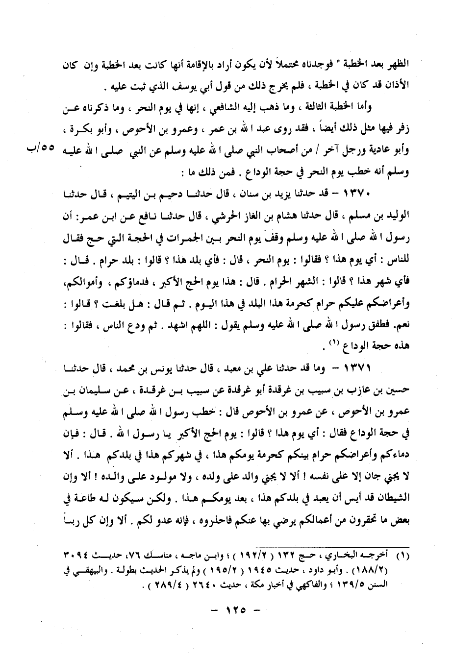 1371 - وَمَا قَدْ حَدَّثَنَا عَلِيُّ بْنُ مَعْبَدٍ، قَالَ: حَدَّثَنَا يُونُسُ بْنُ مُحَمَّدٍ، قَالَ: حَدَّثَنَا حُسَيْنُ بْنُ عَازِبِ بْنِ سَبِيبِ بْنِ غَرْقَدَةَ أَبُو غَرْقَدَةَ، عَنْ سَبِيبِ بْنِ غَرْقَدَةَ، عَنْ سُلَيْمَانَ بْنِ عَمْرِو بْنِ الْأَحْوَصِ، عَنْ عَمْرِو بْنِ الْأَحْوَصِ، قَالَ: خَطَبَ رَسُولُ اللهِ صَلَّى اللَّهُ عَلَيْهِ وَسَلَّمَ فِي حَجَّةِ الْوَدَاعِ، فَقَالَ: " أَيُّ يَوْمٍ هَذَا؟ " قَالُوا: يَوْمُ الْحَجِّ الْأَكْبَرِ يَا رَسُولَ اللهِ قَالَ: " فَإِنَّ دِمَاءَكُمْ وَأَعْرَاضَكُمْ حَرَامٌ بَيْنَكُمْ كَحُرْمَةِ يَوْمِكُمْ هَذَا، فِي شَهْرِكُمْ هَذَا، فِي بَلَدِكُمْ هَذَا، أَلَا لَا يَجْنِي جَانٍ إِلَّا عَلَى نَفْسِهِ، أَلَا لَا يجَنْيِ وَالِدٌ عَلَى وَلَدِهِ، وَلَا مَوْلُودٌ عَلَى وَالِدِهِ، أَلَا وَإِنَّ الشَّيْطَانَ قَدْ أَيِسَ أَنْ يُعْبَدَ فِي بَلَدِكُمْ هَذَا بَعْدَ يَوْمِكُمْ هَذَا، وَلَكِنْ سَيَكُونُ لَهُ طَاعَةٌ فِي بَعْضِ مَا تَحْقِرُونَ مِنْ أَعْمَالِكُمْ يَرْضَى بِهَا عَنْكُمْ فَاحْذَرُوهُ، فَإِنَّهُ عَدُوٌّ لَكُمْ أَلَا وَإِنَّ كُلَّ رِبًا