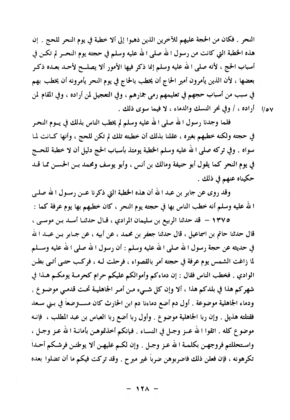 1375 - قَدْ حَدَّثَنَا الرَّبِيعُ بْنُ سُلَيْمَانَ الْمُرَادِيُّ، قَالَ: حَدَّثَنَا أَسَدُ بْنُ مُوسَى، قَالَ: حَدَّثَنَا حَاتِمُ بْنُ إِسْمَاعِيلَ، قَالَ: حَدَّثَنَا جَعْفَرُ بْنُ مُحَمَّدٍ، عَنْ أَبِيهِ، عَنْ جَابِرِ بْنِ عَبْدِ اللهِ، فِي حَدِيثِهِ عَنْ حَجَّةِ رَسُولِ اللهِ صَلَّى اللَّهُ عَلَيْهِ وَسَلَّمَ، أَنَّ رَسُولَ اللهِ صَلَّى اللَّهُ عَلَيْهِ وَسَلَّمَ لَمَّا زَاغَتِ الشَّمْسُ يَوْمَ عَرَفَةَ فِي حَجَّتِهِ أَمَرَ بِالْقَصْوَاءِ، فَرُحِّلَتْ لَهُ، فَرَكِبَ حَتَّى أَتَى بَطْنَ الْوَادِي، فَخَطَبَ النَّاسَ، فَقَالَ: " إِنَّ دِمَاءَكُمْ وَأَمْوَالَكُمْ عَلَيْكُمْ حَرَامٌ كَحُرْمَةِ يَوْمِكُمْ هَذَا فِي شَهْرِكُمْ هَذَا فِي بَلَدِكُمْ هَذَا، أَلَا وَإِنَّ كُلَّ شَيْءٍ مِنْ أَمْرِ الْجَاهِلِيَّةِ تَحْتَ قَدَمَيَّ مَوْضُوعٌ، وَدِمَاءُ الْجَاهِلِيَّةِ مَوْضُوعَةٌ، أَوَّلُ دَمٍ أَضَعُ دِمَاءَنَا دَمَ ابْنِ الْحَارِثِ، كَانَ مَسْتَرْضَعًا فِي بَنِي سَعْدٍ، فَقَتَلَتْهُ هُذَيْلٌ، وَإِنَّ رِبَا الْجَاهِلِيَّةِ مَوْضُوعٌ، وَأَوَّلُ رِبًا أَضَعُ رِبَا الْعَبَّاسِ بْنِ عَبْدِ الْمُطَّلِبِ، فَإِنَّهُ مَوْضُوعٌ كُلُّهُ، اتَّقُوا اللهَ عَزَّ وَجَلَّ فِي النِّسَاءِ، فَإِنَّكُمْ أَخَذْتُمُوهُنَّ بِأَمَانَةِ اللهِ عَزَّ وَجَلَّ، وَاسْتَحْلَلْتُمْ فُرُوجَهُنَّ بِكَلِمَةِ اللهِ عَزَّ وَجَلَّ، وَإِنَّ لَكُمْ عَلَيْهِنَّ أَلَّا يُوَطِّئْنَ فُرَشَكُمْ أَحَدًا تَكْرَهُونَهُ، فَإِنْ فَعَلْنَ ذَلِكَ فَاضْرِبُوهُنَّ ضَرْبًا غَيْرَ مُبَرِّحٍ وَقَدْ تَرَكْتُ فِيكُمْ مَا لَنْ تَضِلُّوا بَعْدَهُ،