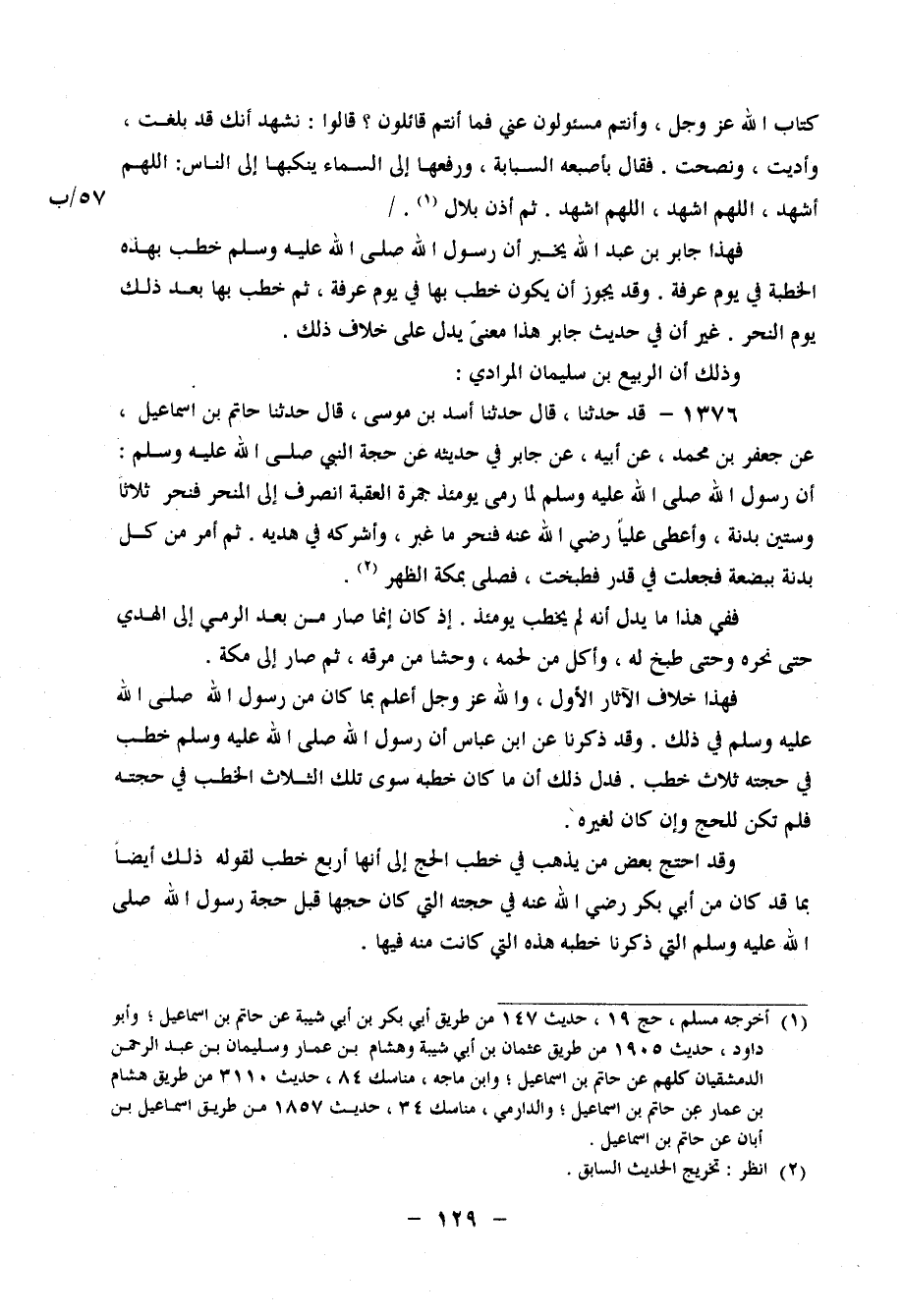 1376 - وَذَلِكَ أَنَّ الرَّبِيعَ بْنَ سُلَيْمَانَ الْمُرَادِيَّ: قَدْ حَدَّثَنَا، قَالَ: حَدَّثَنَا أَسَدُ بْنُ مُوسَى، قَالَ: حَدَّثَنَا حَاتِمُ بْنُ إِسْمَاعِيلَ، عَنْ جَعْفَرِ بْنِ مُحَمَّدٍ، عَنْ أَبِيهِ، عَنْ جَابِرٍ، فِي حَدِيثِهِ عَنْ حَجَّةِ النَّبِيِّ صَلَّى اللَّهُ عَلَيْهِ وَسَلَّمَ، " أَنَّ رَسُولَ اللهِ صَلَّى اللَّهُ عَلَيْهِ وَسَلَّمَ لَمَّا رَمَى يَوْمَئِذٍ جَمْرَةَ الْعَقَبَةِ، انْصَرَفَ إِلَى الْمَنْحَرِ، فَنَحَرَ ثَلَاثًا وَسِتِّينَ بَدَنَةً، وَأَعْطَى عَلِيًّا رَضِيَ اللهُ عَنْهُ، فَنَحَرَ مَا غَبَرَ، وَأَشْرَكَهُ فِي هَدْيِهِ، ثُمَّ أَمَرَ مِنْ كُلِّ بَدَنَةٍ بِبُضْعَةٍ، فَجُعِلَتْ فِي قِدْرٍ، فَطُبِخَتْ، فَصَلَّى بِمَكَّةَ الظُّهْرَ " فَفِي هَذَا مَا يَدُلُّ أَنَّهُ لَمْ يَخْطُبْ يَوْمَئِذٍ، إِذْ كَانَ إِنَّمَا صَارَ مِنْ بَعْدِ الرَّمْيِ إِلَى الْهَدْيِ حَتَّى نَحَرَهُ، وَحَتَّى طُبِخَ لَهُ، وَأَكَلَ مِنْ لَحْمِهِ، وَحَشَا مِنْ مَرَقِهِ، ثُمَّ صَارَ إِلَى مَكَّةَ فَهَذَا خِلَافُ الْآثَارِ الْأُوَلِ، وَاللهُ عَزَّ وَجَلَّ أَعْلَمُ بِمَا كَانَ مِنْ رَسُولِ اللهِ صَلَّى اللَّهُ عَلَيْهِ وَسَلَّمَ فِي ذَلِكَ وَقَدْ ذَكَرْنَا عَنِ ابْنِ عَبَّاسٍ، أَنَّ رَسُولَ اللهِ صَلَّى اللَّهُ عَلَيْهِ وَسَلَّمَ خَطَبَ فِي حَجَّتِهِ ثَلَاثَ خُطَبٍ، فَدَلَّ ذَلِكَ أَنَّ مَا كَانَ خَطَبَهُ سِوَى تِلْكَ الثَّلَاثِ الْخُطَبِ فِي حَجَّتِهِ فَلَمْ تَكُنْ لِلْحَجِّ، وَإِنْ كَانَ لِغَيْرِهِ وَقَدِ احْتَجَّ بَعْضُ مَنْ يَذْهَبُ فِي خُطَبِ الْحَجِّ إِلَى أَنَّهَا أَرْبَعُ خُطَبٍ لِقَوْلِهِ ذَلِكَ أَيْضًا بِمَا قَدْ كَانَ مِنْ أَبِي