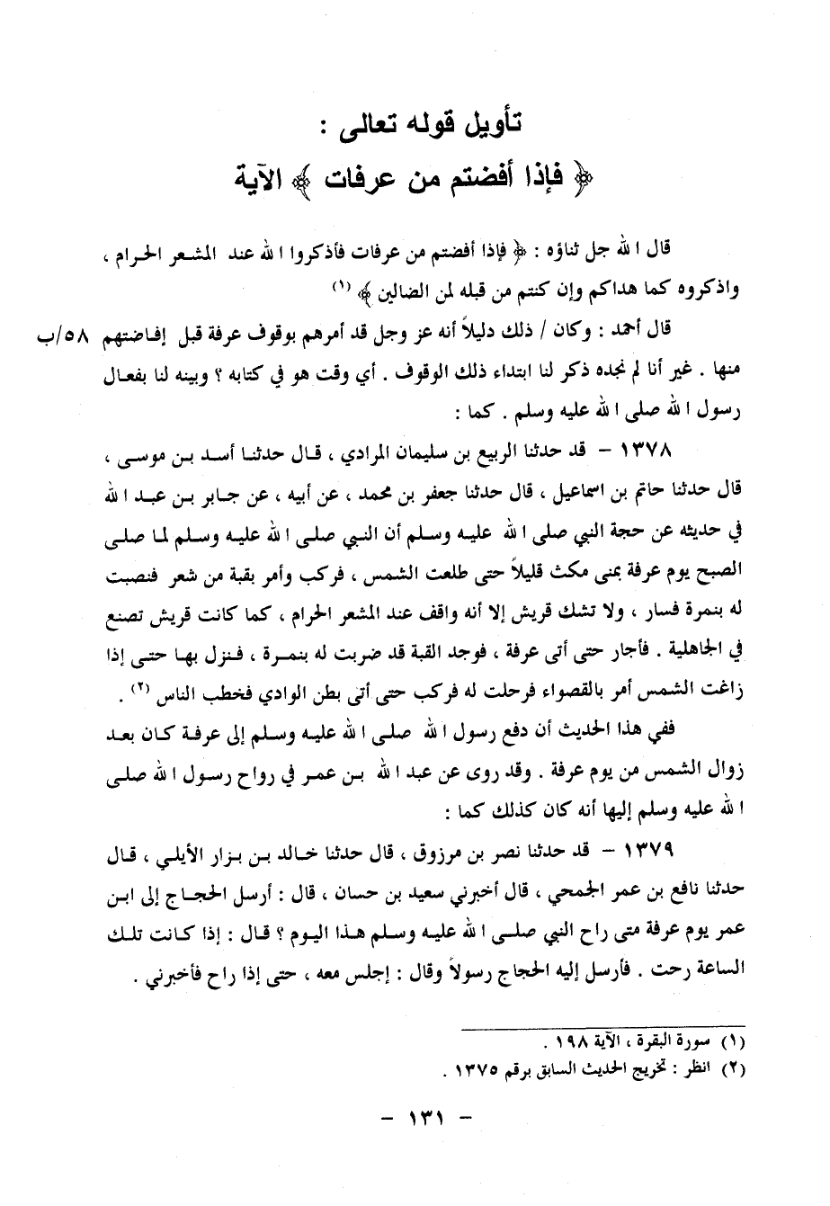 قَالَ اللهُ جَلَّ ثَنَاؤُهُ: {فَإِذَا أَفَضْتُمْ مِنْ عَرَفَاتٍ فَاذْكُرُوا اللهَ عِنْدَ الْمَشْعَرِ الْحَرَامِ وَاذْكُرُوهُ كَمَا هَدَاكُمْ وَإِنْ كُنْتُمْ مِنْ قَبْلِهِ لَمِنَ الضَّالِّينَ} قَالَ أَحْمَدُ: وَكَانَ ذَلِكَ دَلِيلًا أَنَّهُ عَزَّ وَجَلَّ قَدْ أَمَرَهُمْ بِوُقُوفِ عَرَفَةَ قَبْلَ إِفَاضَتِهِمْ مِنْهَا، غَيْرَ أَنَّا لَمْ نَجِدْهُ ذَكَرَ لَنَا ابْتِدَاءَ ذَلِكَ الْوُقُوفِ، أَيَّ وَقْتٍ هُوَ فِي كِتَابِهِ؟ وَبَيَّنَهُ لَنَا بِفِعَالِ رَسُولِ اللهِ صَلَّى اللَّهُ عَلَيْهِ وَسَلَّمَ، كَمَا