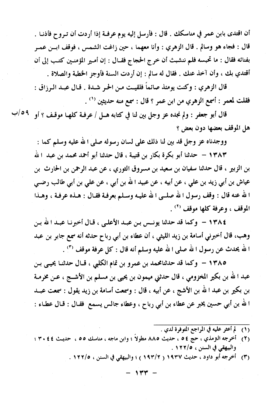 أَنِ اقْتَدِي بِابْنِ عُمَرَ فِي مَنَاسِكِكَ قَالَ: فَأَرْسَلَ إِلَيْهِ يَوْمَ عَرَفَةَ، إِذَا أَرَدْتَ أَنْ تَرُوحَ فَأْذِنَّا قَالَ: فَجَاءَ هُوَ وَسَالِمٌ، قَالَ الزُّهْرِيُّ وَأَنَا مَعَهُمْ، حِينَ زَاغَتِ الشَّمْسُ، فَوَقَفَ ابْنُ عُمَرَ بِفِنَائِهِ، فَقَالَ: " مَا تَحْبِسُهُ "، فَلَمْ يَلْبَثْ أَنْ خَرَجَ الْحَجَّاجُ، فَقَالَ: إِنَّ أَمِيرَ الْمُؤْمِنِينَ كَتَبَ إِلَيَّ أَنِ أَقَتِدي بِكَ، وَأَنْ آخُذُ عَنْكَ فَقَالَ لَهُ سَالِمٌ: إِنْ أَرَدْتَ السُّنَّةَ فَأَوْجِزِ الْخُطْبَةَ وَالصَّلَاةَ قَالَ الزُّهْرِيُّ: وَكُنْتُ يَوْمَئِذٍ صَائِمًا، فَلَقِيتُ مِنَ الْحَرِّ شِدَّةً قَالَ عَبْدُ الرَّزَّاقِ: فَقُلْتُ لِمَعْمَرٍ: أَسَمِعَ الزُّهْرِيُّ مِنَ ابْنِ عُمَرَ؟ قَالَ: سَمِعَ مِنْهُ حَدِيثَيْنِ قَالَ أَبُو جَعْفَرٍ: وَلَمْ نَجِدْهُ عَزَّ وَجَلَّ بَيَّنَ لَنَا فِي كِتَابِهِ هَلْ عَرَفَةُ كُلُّهَا مَوْقِفٌ؟ أَوْ هَلِ الْمَوْقِفُ بَعْضُهَا دُونَ بَعْضٍ؟ وَوَجَدْنَاهُ عَزَّ وَجَلَّ قَدْ بَيَّنَ لَنَا ذَلِكَ عَلَى لِسَانِ رَسُولِهِ صَلَّى اللَّهُ عَلَيْهِ وَسَلَّمَ كَمَا