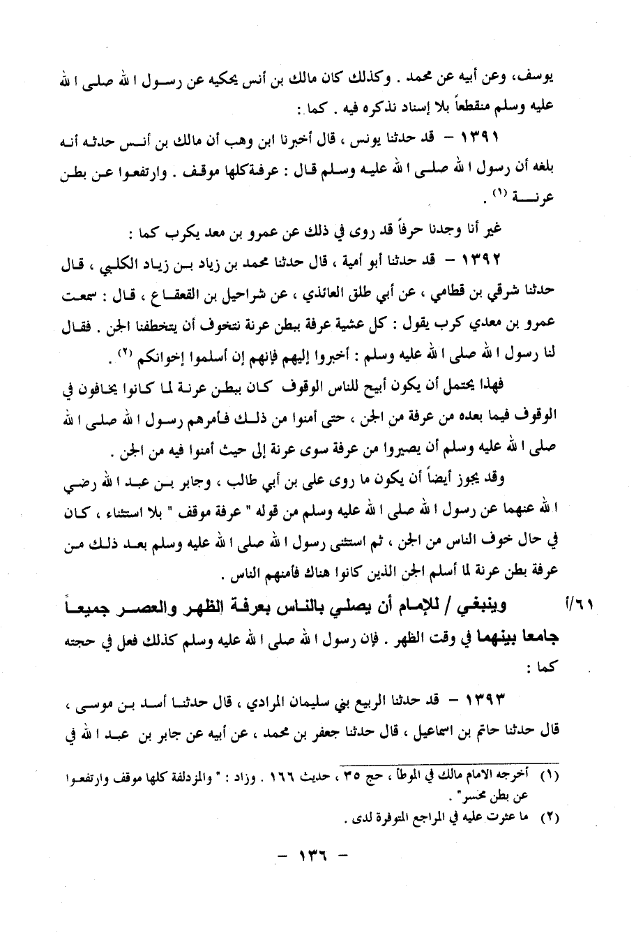 1391 - قَدْ حَدَّثَنَا يُونُسُ، قَالَ: أَخْبَرَنَا ابْنُ وَهْبٍ، أَنَّ مَالِكَ بْنَ أَنَسٍ، حَدَّثَهُ أَنَّهُ بَلَغَهُ أَنَّ رَسُولَ اللهِ صَلَّى اللَّهُ عَلَيْهِ وَسَلَّمَ، قَالَ: " عَرَفَةُ كُلُّهَا مَوْقِفٌ، وَارْتَفِعُوا مِنْ بَطْنِ عُرَنَةَ " غَيْرَ أَنَّا وَجَدْنَا حَرْفًا قَدْ رُوِيَ فِي ذَلِكَ عَنْ عَمْرِو بْنِ مَعْدِي كَرِبَ كَمَا