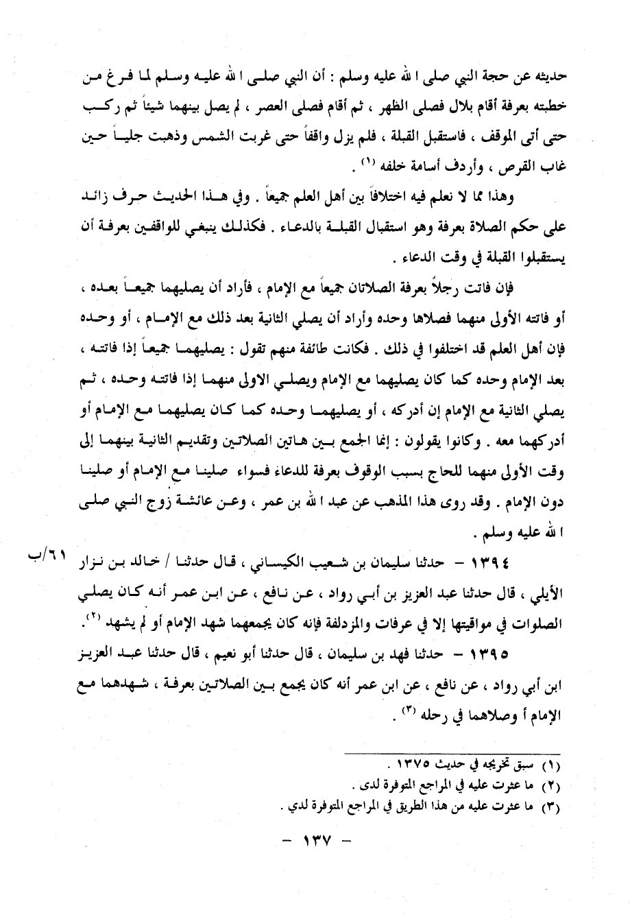 1394 - حَدَّثَنَا سُلَيْمَانُ بْنُ شُعَيْبٍ الْكَيْسَانِيُّ، قَالَ: حَدَّثَنَا خَالِدُ بْنُ نِزَارٍ الْأَيْلِيُّ، قَالَ: حَدَّثَنَا عَبْدُ الْعَزِيزِ بَنْ أَبِي رَوَّادٍ، عَنْ نَافِعٍ، عَنِ ابْنِ عُمَرَ، " أَنَّهُ كَانَ يُصَلِّي الصَّلَوَاتِ فِي مَوَاقِيتِهَا إِلَّا فِي عَرَفَاتٍ وَالْمُزْدَلِفَةِ، فَإِنَّهُ كَانَ يَجْمَعُهُمَا، شَهِدَ الْإِمَامَ أَوْ لَمْ يَشْهَدْ "