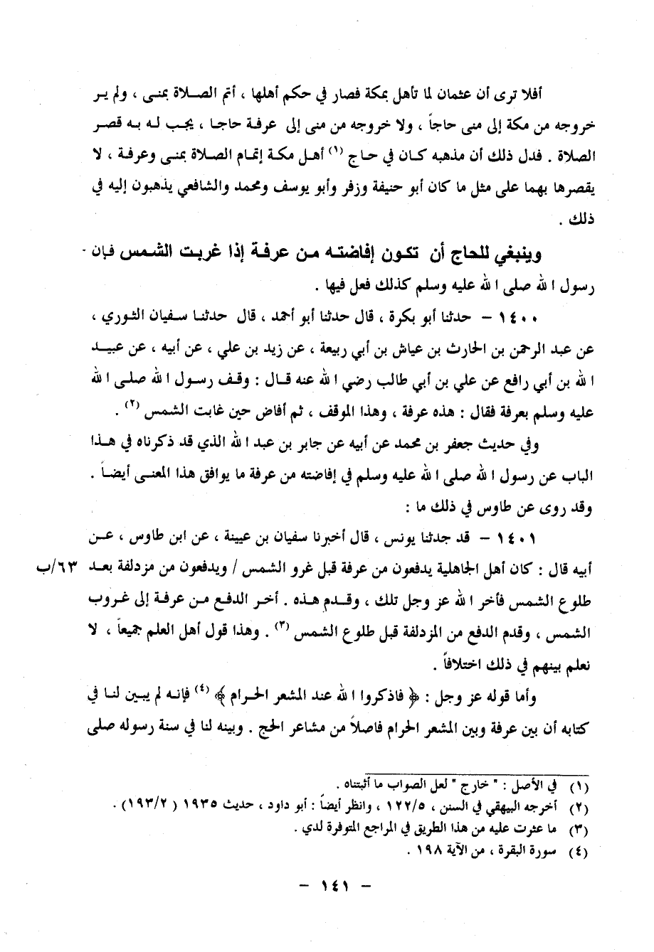 1401 - قَدْ حَدَّثَنَا يُونُسُ، قَالَ: أَخْبَرَنَا سُفْيَانُ بْنُ عُيَيْنَةَ، عَنِ ابْنِ طَاوُسٍ، عَنْ أَبِيهِ، قَالَ: " كَانَ أَهْلُ الْجَاهِلِيَّةِ يَدْفَعُونَ مِنْ عَرَفَةَ قَبْلَ غُرُوبِ الشَّمْسِ، وَيَدْفَعُونَ مِنْ مُزْدَلِفَةَ بَعْدَ طُلُوعِ الشَّمْسِ، فَأَخَّرَ اللهُ عَزَّ وَجَلَّ تِلْكَ، وَقَدَّمَ هَذِهِ، أَخَّرَ الدَّفْعَ مِنْ عَرَفَةَ إِلَى غُرُوبِ الشَّمْسِ، وَقَّدَمَ الدَّفْعَ مِنَ الْمُزْدَلِفَةِ قَبْلَ طُلُوعِ الشَّمْسِ " وَهَذَا قَوْلُ أَهْلِ الْعِلْمِ جَمِيعًا، لَا نَعْلَمُ بَيْنَهُمْ فِي ذَلِكَ اخْتِلَافًا وَأَمَّا قَوْلُهُ عَزَّ وَجَلَّ: {فَاذْكُرُوا اللهَ عِنْدَ الْمَشْعَرِ الْحَرَامِ} ، فَإِنَّهُ لَمْ يُبَيِّنْ لَنَا فِي كِتَابِهِ أَنَّ بَيْنَ عَرَفَةَ وَبَيْنَ الْمَشْعَرِ الْحَرَامِ فَاصِلًا مِنْ مَشَاعِرِ الْحَجِّ،
