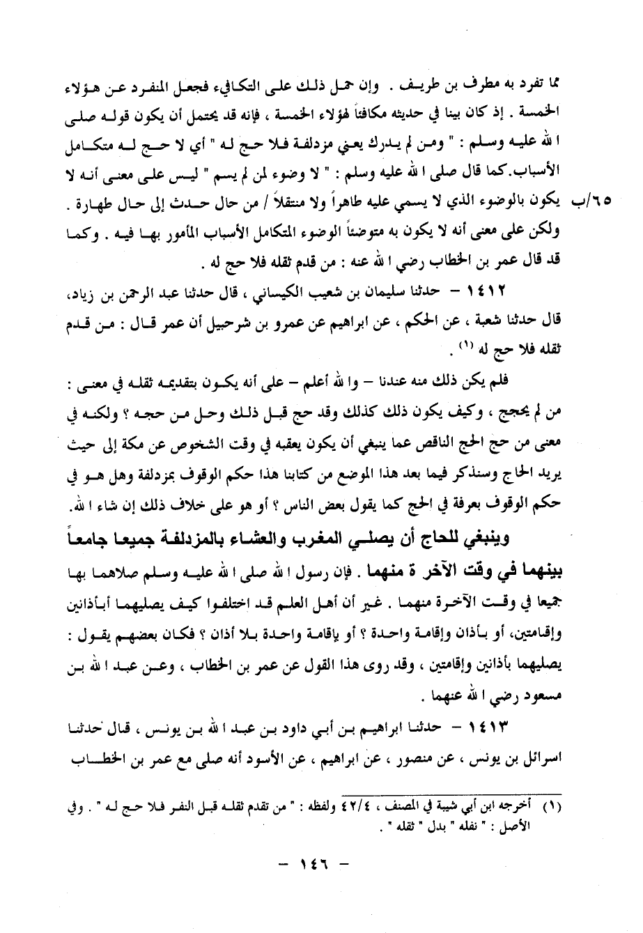 1412 - حَدَّثَنَا سُلَيْمَانُ بْنُ شُعَيْبٍ الْكَيْسَانِيُّ، قَالَ: حَدَّثَنَا عَبْدُ الرَّحْمَنِ بْنُ زِيَادٍ، قَالَ: حَدَّثَنَا شُعْبَةُ، عَنِ الْحَكَمِ، عَنْ إِبْرَاهِيمَ، عَنْ عَمْرِو بْنِ شُرَحْبِيلَ، أَنَّ عُمَرَ، قَالَ: " مَنْ قَدَّمَ ثَقَلَهُ فَلَا حَجَّ لَهُ " فَلَمْ يَكُنْ ذَلِكَ مِنْهُ عِنْدَنَا، وَاللهُ أَعْلَمُ، عَلَى أَنَّهُ يَكُونُ بِتَقْدِيمِهِ ثَقَلِهِ فِي مَعْنَى: مَنْ لَمْ يَحْجُجْ، وَكَيْفَ يَكُونُ ذَلِكَ كَذَلِكَ وَقَدْ حَجَّ قَبْلَ ذَلِكَ وَحَلَّ مِنْ حَجِّهِ؟ وَلَكِنَّهُ فِي مَعْنَى: مَنْ حَجَّ الْحَجَّ النَّاقِصَ عَمَّا يَنْبَغِي أَنْ يَكُونَ يَعْقِبُهُ فِي وَقْتِ الشُّخُوصِ عَنْ مَكَّةَ إِلَى حَيْثُ يُرِيدُ الْحَاجُّ، وَسَنَذْكُرُ فِيمَا بَعْدُ هَذَا الْمَوْضِعَ مِنْ كِتَابِنَا هَذَا، حُكْمَ الْوُقُوفِ بِمُزْدَلِفَةَ، وَهَلْ هُوَ فِي حُكْمِ الْوُقُوفِ بِعَرَفَةَ فِي الْحَجِّ كَمَا يَقُولُ بَعْضُ النَّاسِ، أَوْ هُوَ عَلَى خِلَافِ ذَلِكَ إِنْ شَاءَ اللهُ وَيَنْبَغِي لِلْحَاجِّ أَنْ يُصَلِّيَ الْمَغْرِبَ وَالْعِشَاءَ بِالْمُزْدَلِفَةِ جَمِيعًا جَامِعًا بَيْنَهُمَا فِي وَقْتِ الْآخِرَةِ مِنْهُمَا، فَإِنَّ رَسُولَ اللهِ صَلَّى اللَّهُ عَلَيْهِ وَسَلَّمَ صَلَّاهُمَا بِهَا جَمِيعًا فِي وَقْتِ الْآخِرَةِ مِنْهُمَا، غَيْرَ أَنَّ أَهْلَ الْعِلْمِ قَدِ اخْتَلَفُوا كَيْفَ يُصَلِّيهُمَا، أَبِأَذَانَيْنِ وَإِقَامَتَيْنِ، أَوْ بِأَذَانٍ وَإِقَامَة وَاحِدَة؟ أَوْ بِإِقَامَةٍ وَاحِدَةٍ بِلَا أَذَانٍ؟ فَكَانَ بَعْضُهُمْ يَقُولُ: يُصَلِّيهُمَا بِأَذَانَيْنِ وَإِقَامَتَيْنِ، وَقَدْ رُوِيَ هَذَا الْقَوْلُ عَنْ عُمَرَ بْنِ الْخَطَّابِ، وَعَنْ عَبْدِ اللهِ بْنِ مَسْعُودٍ رَضِيَ اللهُ عَنْهُمَا