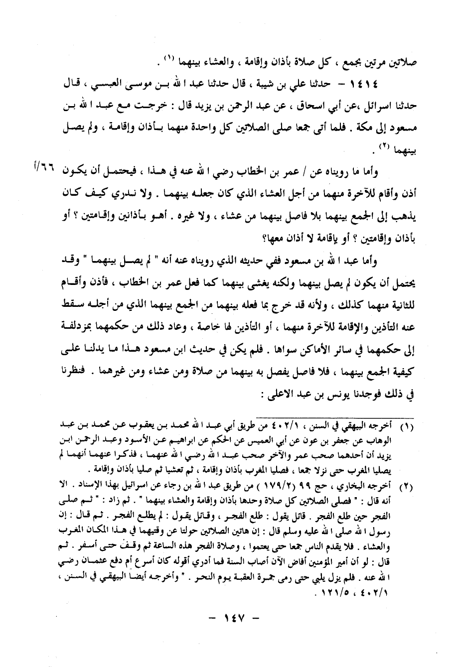 1414 - حَدَّثَنَا عَلِيُّ بْنُ شَيْبَةَ، قَالَ: حَدَّثَنَا عَبْدُ اللهِ بْنُ مُوسَى الْعَبْسِيُّ، قَالَ: حَدَّثَنَا إِسْرَائِيلُ، عَنْ أَبِي إِسْحَاقَ، عَنْ عَبْدِ الرَّحْمَنِ بْنِ يَزِيدَ، قَالَ: " خَرَجْتُ مَعَ عَبْدِ اللهِ بْنِ مَسْعُودٍ إِلَى مَكَّةَ، فَلَمَّا أَتَى جَمْعًا صَلَّى الصَّلاتَيْنِ كُلَّ وَاحِدَةٍ مِنْهُمَا بِأَذَانٍ وَإِقَامَةٍ، وَلَمْ يُصَلِّ بَيْنَهُمَا " وَأَمَّا مَا رُوِّينَاهُ عَنْ عُمَرَ بْنِ الْخَطَّابِ رَضِيَ اللهُ عَنْهُ فِي هَذَا، فَيَحْتَمِلُ أَنْ يَكُونَ أَذَّنَ وَأَقَامَ لِلْآخِرَةِ مِنْهُمَا مِنْ أَجْلِ الْعِشَاءِ الَّذِي كَانَ جَعَلَهُ بَيْنَهُمَا وَلَا نَدْرِي كَيْفَ كَانَ يَذْهَبُ إِلَى الْجَمْعِ بَيْنَهُمَا بِلَا فَاصِلٍ بَيْنَهُمَا مِنْ عِشَاءٍ، وَلَا غَيْرِهِ، أَهُوَ بِأَذَانَيْنِ وَإِقَامَتَيْنِ؟ أَوْ بِأَذَانٍ وَإِقَامَتَيْنِ؟ أَوْ بِإِقَامَةٍ لَا أَذَانَ مَعَهَا؟ وَأَمَّا عَبْدُ اللهِ بْنُ مَسْعُودٍ فَفِي حَدِيثِهِ الَّذِي رُوِّينَاهُ عَنْهُ، أَنَّهُ " لَمْ يُصَلِّ بَيْنَهُمَا "، وَقَدْ يَحْتَمِلُ أَنْ يَكُونَ لَمْ يُصَلِّ بَيْنَهُمَا، وَلَكِنَّهُ يَغْشَى بَيْنَهُمَا كَمَا فَعَلَ عُمَرُ بْنُ الْخَطَّابِ، فَأَذَّنَ وَأَقَامَ لِلثَّانِيَةِ مِنْهُمَا كَذَلِكَ، وَلِأَنَّهُ قَدْ خَرَجَ بِمَا فَعَلَهُ بَيْنَهُمَا مِنَ الْجَمْعِ بَيْنَهُمَا الَّذِي مِنْ أَجْلِهِ سَقَطَ عَنْهُ التَّأْذِينُ وَالْإِقَامَةُ لِلْآخِرَةِ مِنْهُمَا، أَوِ التَّأْذِينُ لَهَا خَاصَّةً، وَعَادَ ذَلِكَ مِنْ حُكْمِهِمَا بِمُزْدَلِفَةَ إِلَى حُكْمِهِمَا فِي سَائِرِ الْأَمَاكِنِ سِوَاهَا فَلَمْ يَكُنْ فِي حَدِيثِ ابْنِ مَسْعُودٍ هَذَا مَا يَدُلُّنَا عَلَى كَيْفِيَّةِ الْجَمْعِ بَيْنَهُمَا،