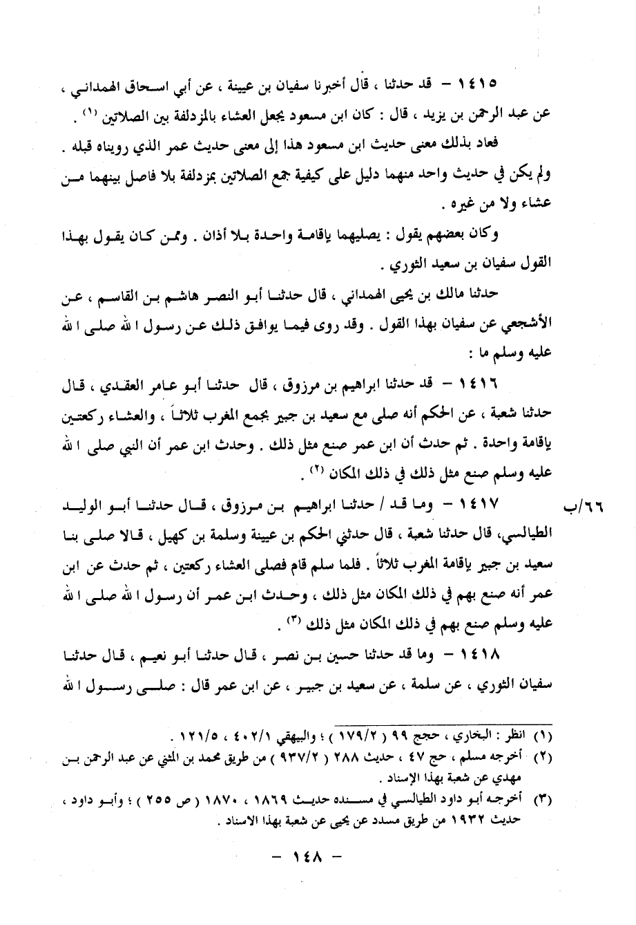 1415 - قَدْ حَدَّثَنَا، قَالَ: أَخْبَرَنَا سُفْيَانُ بْنُ عُيَيْنَةَ، عَنْ أَبِي إِسْحَاقَ الْهَمْدَانِيِّ، عَنْ عَبْدِ الرَّحْمَنِ بْنِ يَزِيدَ، قَالَ: " كَانَ ابْنُ مَسْعُودٍ يَجْعَلُ الْعِشَاءَ بِالْمُزْدَلِفَةِ بَيْنَ الصَّلَاتَيْنِ " فَعَادَ بِذَلِكَ مَعْنَى حَدِيثِ ابْنِ مَسْعُودٍ هَذَا إِلَى مَعْنَى حَدِيثِ عُمَرَ الَّذِي رُوِّينَاهُ قَبْلَهُ وَلَمْ يَكُنْ فِي حَدِيثٍ وَاحِدٍ مِنْهُمَا دَلِيلٌ عَلَى كَيْفِيَّةِ جَمْعِ الصَّلَاتَيْنِ بِمُزْدَلِفَةَ بِلَا فَاصِلٍ بَيْنَهُمَا مِنْ عَشَاءٍ وَلَا مِنْ غَيْرِهِ وَكَانَ بَعْضُهُمْ يَقُولُ: يُصَلِّيهُمَا بِإِقَامَةٍ وَاحِدَةٍ بِلَا أَذَانٍ وَمِمَّنْ كَانَ يَقُولُ بِهَذَا الْقَوْلِ سُفْيَانُ بْنُ سَعِيدٍ الثَّوْرِيُّ حَدَّثَنَا مَالِكُ بْنُ يَحْيَى الْهَمْدَانِيُّ، قَالَ: حَدَّثَنَا أَبُو النَّضْرِ هَاشِمُ بْنُ الْقَاسِمِ، عَنِ الْأَشْجَعِيِّ، عَنْ سُفْيَانَ، بِهَذَا الْقَوْلِ وَقَدْ رُوِيَ فِيمَا يُوَافِقُ ذَلِكَ عَنْ رَسُولِ اللهِ صَلَّى اللَّهُ عَلَيْهِ وَسَلَّمَ مَا