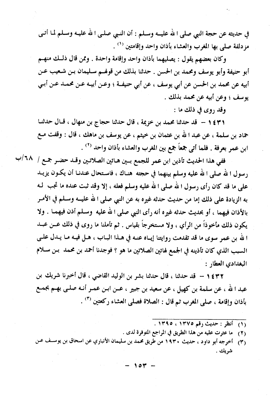 1431 - قَدْ حَدَّثَنَا مُحَمَّدُ بْنُ خُزَيْمَةَ، قَالَ: حَدَّثَنَا حَجَّاجُ بْنُ مِنْهَالٍ، قَالَ: حَدَّثَنَا حَمَّادُ بْنُ سَلَمَةَ، عَنْ عَبْدِ اللهِ بْنِ عُثْمَانَ بْنِ خَيْثَمَ، عَنْ يُوسُفَ بْنِ مَاهِكَ، قَالَ: " وَقَفْتُ مَعَ ابْنِ عُمَرَ بِعَرَفَةَ، فَلَمَّا أَتَى جَمْعًا جَمَعَ بَيْنَ الْمَغْرِبِ وَالْعِشَاءِ بِأَذَانٍ وَاحِدٍ " فَفِي هَذَا الْحَدِيثِ تَأْذِينُ ابْنِ عُمَرَ لِلْجَمْعِ بَيْنَ هَاتَيْنِ الصَّلَاتَيْنِ وَقَدْ حَضَرَ جَمْعَ رَسُولِ اللهِ صَلَّى اللَّهُ عَلَيْهِ وَسَلَّمَ بَيْنَهُمَا فِي حَجَّتِهِ هُنَاكَ، فَاسْتَحَالَ عِنْدَنَا أَنْ يَكُونَ يَزِيدُ عَلَى مَا قَدْ كَانَ رَأَى رَسُولَ اللهِ صَلَّى اللَّهُ عَلَيْهِ وَسَلَّمَ فَعَلَهُ، إِلَّا وَقَدْ ثَبَتَ عِنْدَهُ مَا تَجِبُ بِهِ الزِّيَادَةُ عَلَى ذَلِكَ إِمَّا مِنْ حَدِيثٍ حَدَّثَهُ غَيْرُهُ بِهِ عَنِ النَّبِيِّ صَلَّى اللَّهُ عَلَيْهِ وَسَلَّمَ فِي الْأَمْرِ بِالْأَذَانِ فِيهِمَا، أَوْ بِحَدِيثٍ حَدَّثَهُ غَيْرُهُ أَنَّهُ رَأَى النَّبِيَّ صَلَّى اللَّهُ عَلَيْهِ وَسَلَّمَ أَذَّنَ فِيهِمَا، وَلَا يَكُونُ ذَلِكَ مَأْخُوذًا مِنَ الرَّأْيِ، وَلَا مُسْتَخْرَجًا بِقِيَاسٍ ثُمَّ تَأَمَّلْنَا مَا رُوِيَ فِي ذَلِكَ عَنْ عَبْدِ اللهِ بْنِ عُمَرَ سِوَى مَا تَقَدَّمَتْ رِوَايَتُنَا إِيَّاهُ عَنْهُ فِي هَذَا الْبَابِ، هَلْ فِيهِ مَا يَدُلُّ عَلَى السَّبَبِ الَّذِي كَانَ تَأْذِينُهُ فِي الْجَمْعِ لِهَاتَيْنِ الصَّلَاتَيْنِ، مَا هُوَ؟ فَوَجَدْنَا: