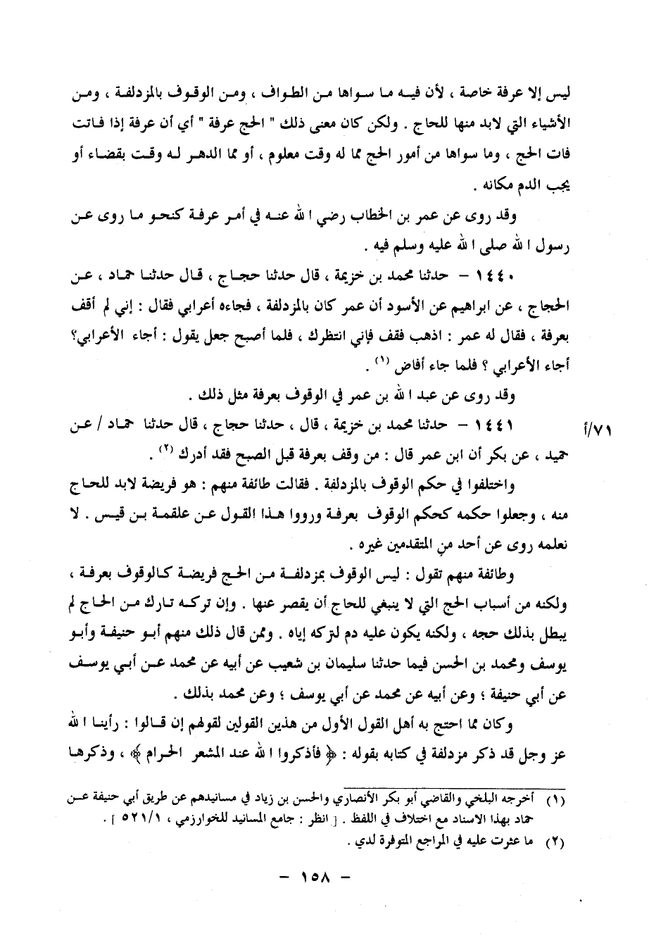 1441 - حَدَّثَنَا مُحَمَّدُ بْنُ خُزَيْمَةَ، قَالَ: حَدَّثَنَا حَجَّاجٌ، قَالَ: حَدَّثَنَا حَمَّادٌ، عَنْ حُمَيْدٍ، عَنْ بَكْرٍ، أَنَّ ابْنَ عُمَرَ، قَالَ: " مَنْ وَقَفَ بِعَرَفَةَ قَبْلَ الصُّبْحِ فَقَدْ أَدْرَكَ " وَاخْتَلَفُوا فِي حُكْمِ الْوُقُوفِ بِالْمُزْدَلِفَةِ، فَقَالَتْ طَائِفَةٌ مِنْهُمْ: هُوَ فَرِيضَةٌ لَا بُدَّ لِلْحَاجِّ مِنْهُ، وَجَعُلوا حُكْمَهُ كَحُكْمِ الْوُقُوفِ بِعَرَفَةَ، وَرَوَوْا هَذَا الْقَوْلَ عَنْ عَلْقَمَةَ بْنِ قَيْسٍ، لَا نَعْلَمُهُ رُوِيَ عَنْ أَحَدٍ مِنَ الْمُتَقَدِّمِينَ غَيْرِهِ وَطَائِفَةٌ مِنْهُمْ، تَقُولُ: لَيْسَ الْوُقُوفُ بِمُزْدَلِفَةَ مِنَ الْحَجِّ فَرِيضَةً كَالْوُقُوفِ بِعَرَفَةَ، وَلَكِنَّهُ مِنْ أَسْبَابِ الْحَجِّ الَّتِي لَا يَنْبَغِي لِلْحَاجِّ أَنْ يُقَصِّرَ عَنْهَا، وَإِنْ تَرَكَهُ تَارِكٌ مِنَ الْحَاجِّ لَمْ يَبْطُلْ بِذَلِكَ حَجُّهُ، وَلَكِنَّهُ يَكُونُ عَلَيْهِ دَمٌ لِتَرْكِهِ إِيَّاهُ