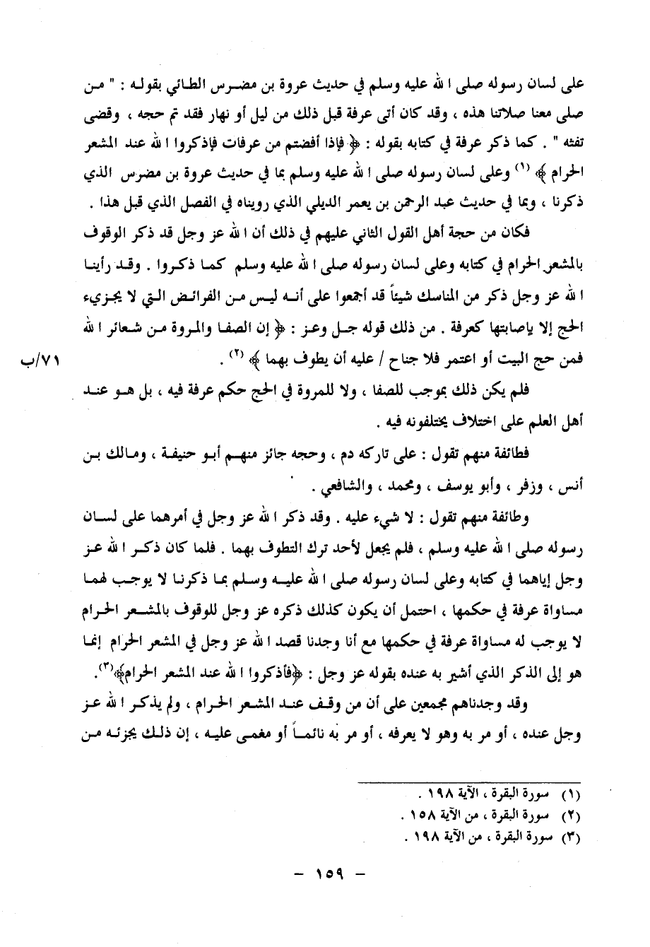 بِهِمَا سُورَة الْبَقَرَة آيَة فَلَمْ يَكُنْ ذَلِكَ بِمُوجِبٍ لِلصَّفَا، وَلَا لِلْمَرْوَةِ فِي الْحَجِّ حُكْمَ عَرَفَةَ فِيهِ، بَلْ هُوَ عِنْدَ أَهْلِ الْعِلْمِ عَلَى اخْتِلَافٍ يَخْتَلِفُونَهُ فِيهِ فَطَائِفَةٌ مِنْهُمْ، تَقُولُ: عَلَى تَارِكِهِ دَمٌ، وَحَجُّهُ جَائِزٌ، مِنْهُمْ أَبُو حَنِيفَةَ، وَمَالِكُ بْنُ أَنَسٍ، وَزُفَرُ، وَأَبُو يُوسُفَ، وَمُحَمَّدٌ، وَالشَّافِعِيُّ وَطَائِفَةٌ مِنْهُمْ، تَقُولُ: لَا شَيْءَ عَلَيْهِ وَقَدْ ذَكَرَ اللهُ عَزَّ وَجَلَّ فِي أَمْرِهِمَا عَلَى لِسَانِ رَسُولِهِ صَلَّى اللَّهُ عَلَيْهِ وَسَلَّمَ، فَلَمْ يَجْعَلْ لِأَحَدٍ تَرْكَ التَّطَوُّفِ بِهِمَا، فَلَمَّا كَانَ ذِكْرُ اللهِ عَزَّ وَجَلَّ إِيَّاهُمَا فِي كِتَابِهِ وَعَلَى لِسَانِ رَسُولِهِ صَلَّى اللَّهُ عَلَيْهِ وَسَلَّمَ بِمَا ذَكَرْنَا لَا يُوجِبُ لَهُمَا مُسَاوَاةَ عَرَفَةَ فِي حُكْمِهَا، احْتَمَلَ أَنْ يَكُونَ كَذَلِكَ ذِكْرُهُ عَزَّ وَجَلَّ لِلْوُقُوفِ بِالْمَشْعَرِ الْحَرَامِ لَا يُوجِبُ لَهُ مُسَاوَاةَ عَرَفَةَ فِي حُكْمِهَا مَعَ أَنَّا وَجَدْنَا قَصْدَ اللهِ عَزَّ وَجَلَّ فِي الْمَشْعَرِ الْحَرَامِ إِنَّمَا هُوَ إِلَى الذِّكْرِ الَّذِي أُشِيرَ بِهِ عِنْدَهُ بِقَوْلِهِ عَزَّ وَجَلَّ: فَاذْكُرُوا اللهَ عِنْدَ الْمَشْعَرِ الْحَرَامِ سُورَة الْبَقَرَة آيَة وَقَدْ وَجَدْنَاهُمْ مُجْمِعِينَ عَلَى أَنَّ مَنْ وَقَفَ عِنْدَ الْمَشْعَرِ الْحَرَامِ، وَلَمْ يَذْكُرِ اللهَ عَزَّ وَجَلَّ عِنْدَهُ، أَوْ مَرَّ بِهِ وَهُوَ لَا يَعْرِفُهُ، أَوْ مَرَّ بِهِ نَائِمًا أَوْ مُغْمًى عَلَيْهِ، أَنَّ ذَلِكَ يُجْزِئُهُ مِنَ