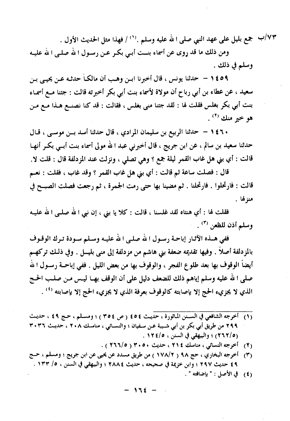 1460 - حَدَّثَنَا الرَّبِيعُ بْنُ سُلَيْمَانَ الْمُرَادِيُّ، قَالَ: حَدَّثَنَا أَسَدُ بْنُ مُوسَى، قَالَ: حَدَّثَنَا سَعِيدُ بْنُ سَالِمٍ، عَنِ ابْنِ جُرَيْجٍ، قَالَ: أَخْبَرَنِي عَبْدُ اللهِ مَوْلَى أَسْمَاءَ بِنْتِ أَبِي بَكْرٍ، أَنَّهَا قَالَتْ: " أَيْ بُنَيَّ، هَلْ غَابَ الْقَمَرُ لَيْلَةَ جَمْعٍ؟ " وَهِيَ تُصَلِّي، وَنَزَلَتْ عِنْدَ الْمُزْدَلِفَةِ، قَالَ: قُلْتُ: لَا قَالَ: فَصَلَّتْ سَاعَةً، ثُمَّ قَالَتْ: " أَيْ بُنَيَّ، هَلْ غَابَ الْقَمَرُ؟ " وَقَدْ غَابَ، فَقُلْتُ: نَعَمْ قَالَتْ: " فَارْتَحِلُوا " فَارْتَحَلْنَا، ثُمَّ مَضَيْنَا بِهَا حَتَّى رَمَتِ الْجَمْرَةَ، ثُمَّ رَجَعَتْ، فَصَلَّتِ الصُّبْحَ فِي مَنْزِلِهَا فَقُلْتُ لَهَا: أَيْ هَنْتَاهْ، لَقَدْ غَلَّسْنَا قَالَتْ: " كَلَّا يَا بُنَيَّ، إِنَّ نَبِيَّ اللهِ صَلَّى اللَّهُ عَلَيْهِ وَسَلَّمَ أَذِنَ لِلظُّعُنِ " فَفِي هَذِهِ الْآثَارِ إِبَاحَةُ رَسُولِ اللهِ صَلَّى اللَّهُ عَلَيْهِ وَسَلَّمَ سَوْدَةَ تَرْكَ الْوُقُوفِ بِالْمُزْدَلِفَةِ أَصْلًا، وَفِيَها تَقْدِيمُهُ ضَعَفَةَ بَنِي هَاشِمٍ مِنْ مُزْدَلِفَةَ إِلَى مِنًى بِلَيْلٍ وَفِي ذَلِكَ تَرْكُهُمْ أَيْضًا الْوُقُوفَ بِهَا بَعْدَ طُلُوعِ الْفَجْرِ، وَالْوُقُوفَ بِهَا