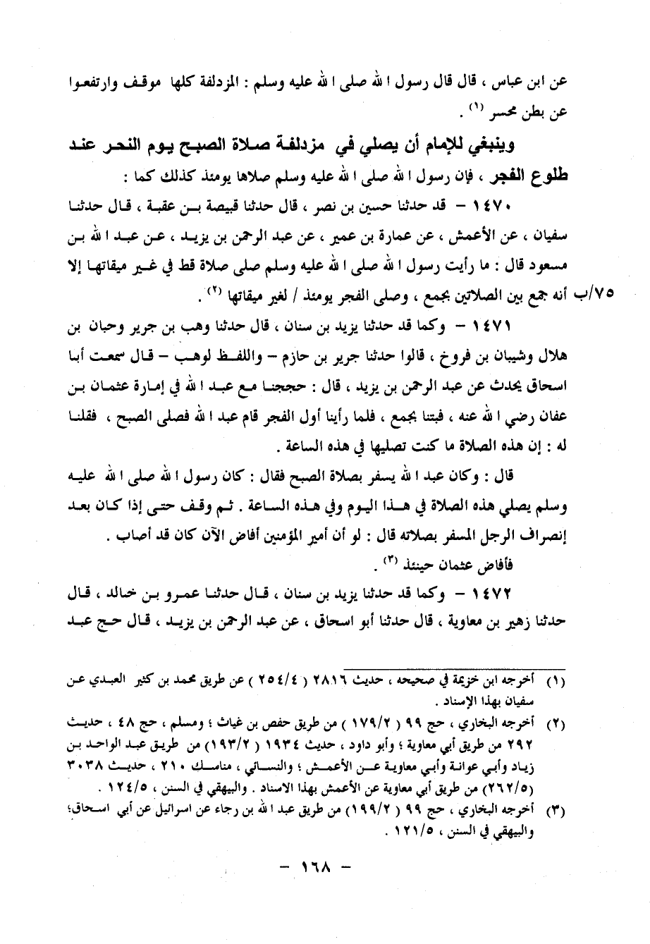 1471 - وَكَمَا قَدْ حَدَّثَنَا يَزِيدُ بْنُ سِنَانٍ، قَالَ: حَدَّثَنَا وَهْبُ بْنُ جَرِيرٍ، وَحَبَّانُ بْنُ هِلَالٍ، وَشَيْبَانُ بْنُ فَرُّوخٍ، قَالُوا: حَدَّثَنَا جَرِيرُ بْنُ حَازِمٍ، وَاللَّفْظُ لِوَهْبٍ، قَالَ: سَمِعْتُ أَبَا إِسْحَاقَ، يُحَدِّثُ عَنْ عَبْدِ الرَّحْمَنِ بْنِ يَزِيدَ، قَالَ: حَجَجْنَا مَعَ عَبْدِ اللهِ فِي إِمَارَةِ عُثْمَانَ بْنِ عَفَّانَ رَضِيَ اللهُ عَنْهُ، فَبِتْنَا بِجَمْعٍ، فَلَمَّا رَأَيْنَا أَوَّلَ الْفَجْرِ قَامَ عَبْدُ اللهِ، فَصَلَّى الصُّبْحَ، فَقُلْنَا لَهُ: إِنَّ هَذِهِ الصَّلَاةَ مَا كُنْتَ تُصَلِّيهَا فِي هَذِهِ السَّاعَةِ قَالَ: وَكَانَ عَبْدُ اللهِ يُسْفِرُ بِصَلَاةِ الصُّبْحِ، فَقَالَ: " كَانَ رَسُولُ اللهِ صَلَّى اللَّهُ عَلَيْهِ وَسَلَّمَ يُصَلِّي هَذِهِ الصَّلَاةَ فِي هَذَا الْيَوْمِ وَفِي هَذِهِ السَّاعَةِ " ثُمَّ وَقَفَ حَتَّى إِذَا كَانَ بَعْدَ انْصِرَافِ الرَّجُلِ الْمُسْفِرِ بِصَلَاتِهِ، قَالَ: لَوْ أَنَّ أَمِيرَ الْمُؤْمِنِينَ أَفَاضَ الْآنَ كَانَ قَدْ أَصَابَ فَأَفَاضَ عُثْمَانُ حِينَئِذٍ