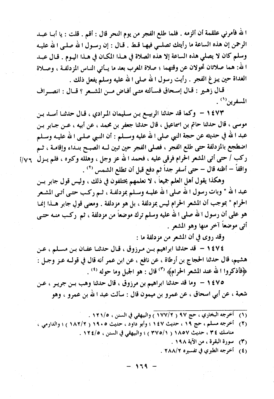 1473 - وَكَمَا قَدْ حَدَّثَنَا الرَّبِيعُ بْنُ سُلَيْمَانَ الْمُرَادِيُّ، قَالَ: حَدَّثَنَا أَسَدُ بْنُ مُوسَى، قَالَ: حَدَّثَنَا حَاتِمُ بْنُ إِسْمَاعِيلَ، قَالَ: حَدَّثَنَا جَعْفَرُ بْنُ مُحَمَّدٍ، عَنْ أَبِيهِ، عَنْ جَابِرِ بْنِ عَبْدِ اللهِ، فِي حَدِيثِهِ عَنْ حَجَّةِ النَّبِيِّ صَلَّى اللَّهُ عَلَيْهِ وَسَلَّمَ، " أَنَّ النَّبِيَّ صَلَّى اللَّهُ عَلَيْهِ وَسَلَّمَ اضْطَجَعَ بِالْمُزْدَلِفَةِ حَتَّى طَلَعَ الْفَجْرُ، فَصَلَّى الْفَجْرَ حِينَ تَبَيَّنَ لَهُ الصُّبْحُ بِنِدَاءٍ وَإِقَامَةٍ، ثُمَّ رَكِبَ حَتَّى أَتَى الْمَشْعَرَ الْحَرَامَ، فَرَقَى عَلَيْهِ، فَحَمِدَ اللهَ عَزَّ وَجَلَّ، وَهَلَّلَهُ، وَكَبَّرَهُ، فَلَمْ يَزَلْ وَاقِفًا، أَظُنُّهُ قَالَ: حَتَّى أَسْفَرَ جِدًّا، ثُمَّ دَفَعَ قَبْلَ أَنْ تَطْلُعَ الشَّمْسُ " وَهَكَذَا يَقُولُ أَهْلُ الْعِلْمِ جَمِيعًا، لَا نَعْلَمُهُمْ يَخْتَلِفُونَ فِي ذَلِكَ، وَلَيْسَ قَوْلُ جَابِرِ بْنِ عَبْدِ اللهِ: " وَبَاتَ رَسُولُ اللهِ صَلَّى اللَّهُ عَلَيْهِ وَسَلَّمَ بِمُزْدَلِفَةَ، ثُمَّ رَكِبَ حَتَّى أَتَى الْمَشْعَرَ الْحَرَامَ "، بِمُوجِبٍ أَنَّ الْمَشْعَرَ الْحَرَامَ لَيْسَ بِمُزْدَلِفَةَ، بَلْ هُوَ مُزْدَلِفَةُ، وَمَعْنَى قَوْلِ جَابِرٍ هَذَا إِنَّمَا هُوَ عَلَى أَنَّ رَسُولَ اللهِ صَلَّى اللَّهُ عَلَيْهِ وَسَلَّمَ تَرَكَ مَوْضِعًا مِنْ مُزْدَلِفَةَ، ثُمَّ رَكِبَ مِنْهُ حَتَّى أَتَى مَوْضِعًا آخَرَ مِنْهَا، وَهُوَ الْمَشْعَرُ وَقَدْ رُوِيَ فِي أَنَّ الْمَشْعَرَ مِنْ مُزْدَلِفَةَ مَا