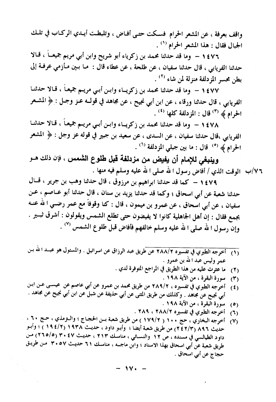 1478 - وَمَا قَدْ حَدَّثَنَا مُحَمَّدُ بْنُ زَكَرِيَّاءَ، وَابْنُ أَبِي مَرْيَمَ، جَمِيعًا، قَالَا: حَدَّثَنَا الْفِرْيَابِيُّ، قَالَ: حَدَّثَنَا سُفْيَانُ، عَنِ السُّدِّيِّ، عَنْ سَعِيدِ بْنِ جُبَيْرٍ، فِي قَوْلِهِ عَزَّ وَجَلَّ: " {الْمَشْعَرِ الْحَرَامِ} ، قَالَ: مَا بَيْنَ جَبَلَيِ الْمُزْدَلِفَةِ " وَيَنْبَغِي لِلْإِمَامِ أَنْ يُفِيضَ مِنْ مُزْدَلِفَةَ قَبْلَ طُلُوعِ الشَّمْسِ، فَإِنَّ ذَلِكَ هُوَ الْوَقْتُ الَّذِي أَفَاضَ رَسُولُ اللهِ صَلَّى اللَّهُ عَلَيْهِ وَسَلَّمَ فِيهِ مِنْهَا