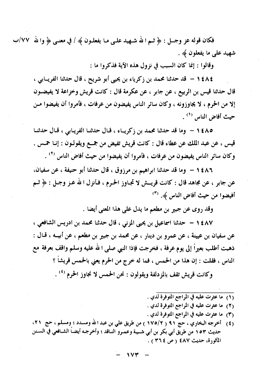1484 - قَدْ حَدَّثَنَا مُحَمَّدُ بْنُ زَكَرِيَّاءَ بْنِ يَحْيَى أَبُو شُرَيْحٍ، قَالَ: حَدَّثَنَا الْفِرْيَابِيُّ، قَالَ: حَدَّثَنَا قَيْسُ بْنُ الرَّبِيعِ، عَنْ جَابِرٍ، عَنْ عِكْرِمَةَ، قَالَ: " كَانَتْ قُرَيْشٌ وَخُزَاعَةُ لَا يَفِيضُونَ إِلَّا مِنَ الْحَرَمِ، لَا يُجَاوِزُونَهُ، وَكَانَ سَائِرُ النَّاسِ يُفِيضُونَ مِنْ عَرَفَاتٍ، فَأُمِرُوا أَنْ يُفِيضُوا مِنْ حَيْثُ أَفَاضَ النَّاسُ "