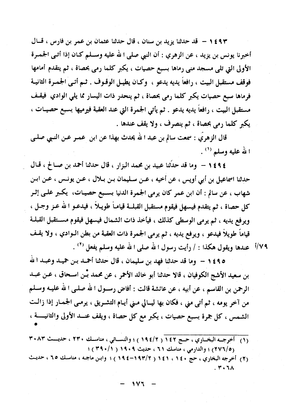 1493 - قَدْ حَدَّثَنَا يَزِيدُ بْنُ سِنَانٍ، قَالَ: حَدَّثَنَا عُثْمَانُ بْنُ عُمَرَ بْنِ فَارِسٍ، قَالَ: أَخْبَرَنَا يُونُسُ بْنُ يَزِيدَ، عَنِ الزُّهْرِيِّ، " أَنَّ النَّبِيَّ صَلَّى اللَّهُ عَلَيْهِ وَسَلَّمَ كَانَ إِذَا أَتَى الْجَمْرَةَ الْأُولَى الَّتِي تَلِي مَسْجِدَ مِنًى رَمَاهَا بِسَبْعِ حَصَيَاتٍ، يُكَبِّرُ كُلَّمَا رَمَى بِحَصَاةٍ، ثُمَّ يَتَقَدَّمُ أَمَامَهَا، فَوَقَفَ مُسْتَقْبِلَ الْبَيْتَ، رَافِعًا يَدَيْهِ يَدْعُو، وَكَانَ يُطِيلُ الْوُقُوفَ، ثُمَّ أَتَى الْجَمْرَةَ الثَّانِيَةَ، فَرَمَاهَا سَبْعَ حَصَيَاتٍ، يُكَبِّرُ كُلَّمَا رَمَى بِحَصَاةٍ، ثُمَّ يَنْحَدِرُ ذَاتَ الْيَسَارِ مِمَّا يَلِي الْوَادِي، فَيَقِفُ مُسْتَقْبِلَ الْبَيْتَ، رَافِعًا يَدَيْهِ يَدْعُو، ثُمَّ يَأْتِي الْجَمْرَةَ الَّتِي عِنْدَ الْعَقَبَةِ، فَيَرْمِيهَا بِسَبْعِ حَصَيَاتٍ، يُكَبِّرُ كُلَّمَا رَمَى بِحَصَاةٍ، ثُمَّ يَنْصَرِفُ، وَلَا يَقِفُ عِنْدَهَا " قَالَ الزُّهْرِيُّ: سَمِعْتُ سَالِمَ بْنَ عَبْدِ اللهِ يُحَدِّثُ بِهَذَا، عَنِ ابْنِ عُمَرَ، عَنِ النَّبِيِّ صَلَّى اللَّهُ عَلَيْهِ وَسَلَّمَ
