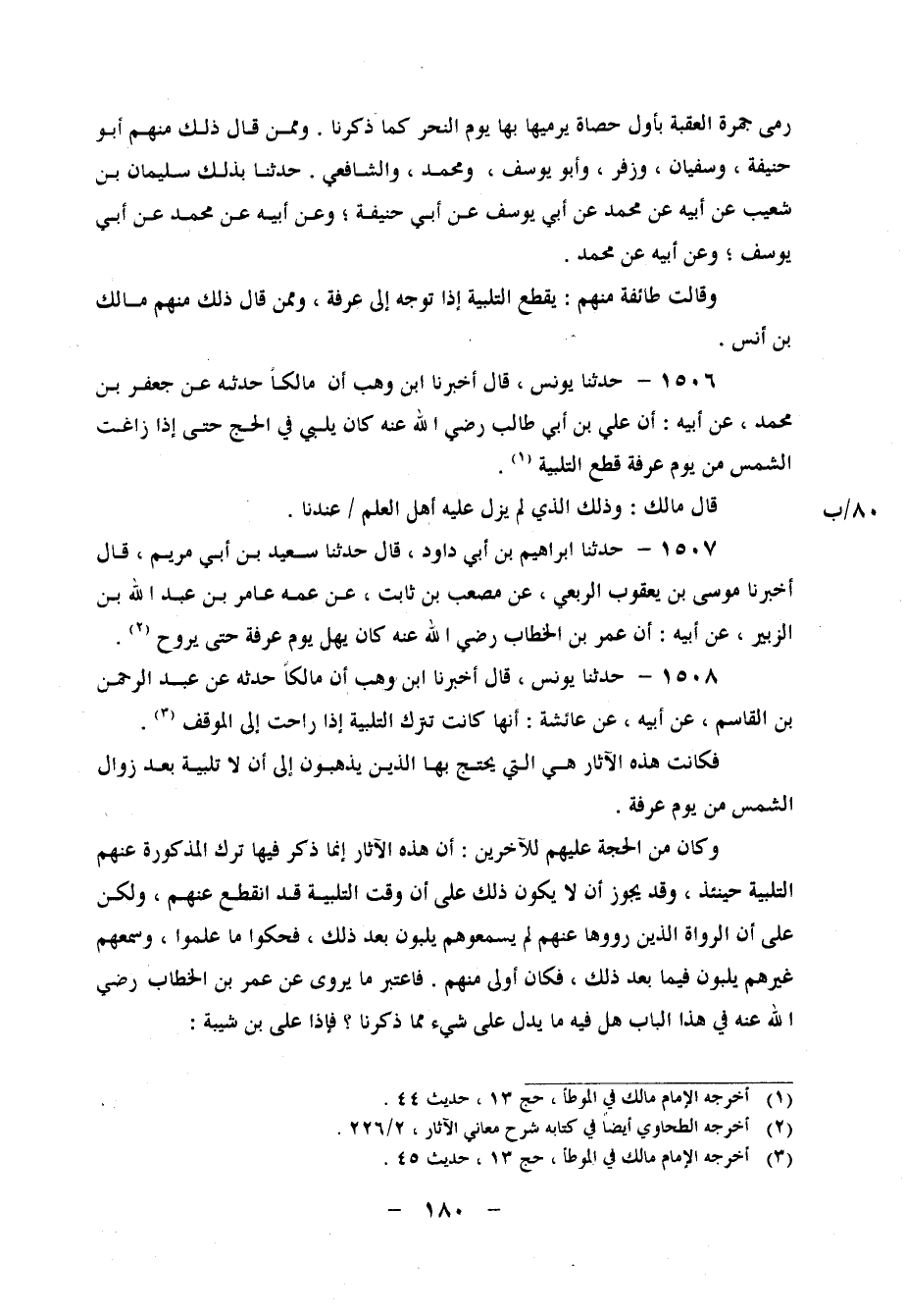 1506 - حَدَّثَنَا يُونُسُ، قَالَ: أَخْبَرَنَا ابْنُ وَهْبٍ، أَنَّ مَالِكًا، حَدَّثَهُ عَنْ جَعْفَرِ بْنِ مُحَمَّدٍ، عَنْ أَبِيهِ، أَنَّ عَلِيَّ بْنَ أَبِي طَالِبٍ رَضِيَ اللهُ عَنْهُ " كَانَ يُلَبِّي فِي الْحَجِّ حَتَّى إِذَا زَاغَتِ الشَّمْسُ مِنْ يَوْمِ عَرَفَةَ قَطَعَ التَّلْبِيَةَ " قَالَ مَالِكٌ: وَذَلِكَ الَّذِي لَمْ يَزَلْ عَلَيْهِ أَهْلُ الْعِلْمِ عِنْدَنَا