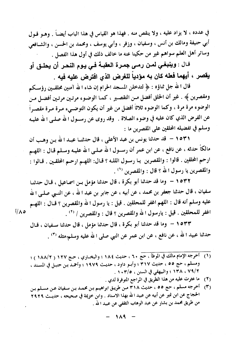 فِي عَدَدِهِ، لَا يُزَادُ عَلَيْهِ، وَلَا يُنْقَصُ مِنْهُ فَهَذَا هُوَ الْقِيَاسُ فِي هَذَا الْبَابِ أَيْضًا، وَهُوَ قَوْلُ أَبِي حَنِيفَةَ، وَمَالِكِ بْنِ أَنَسٍ، وَسُفْيَانَ، وَزُفَرَ، وَأَبِي يُوسُفَ، وَمُحَمَّدِ بْنِ الْحَسَنِ، وَالشَّافِعِيِّ، وَسَائِرِ أَهْلِ الْعِلْمِ سِوَاهُمْ غَيْرَ مَنْ حَكَيْنَا عَنْهُ مَا خَالَفَ ذَلِكَ فِي أَوَّلِ هَذَا الْفَصْلِ قَالَ: وَيَنْبَغِي لِمَنْ رَمَى جَمْرَةَ الْعَقَبَةِ فِي يَوْمِ النَّحْرِ أَنْ يَحْلِقَ أَوْ يُقَصِّرَ، أَيُّهُمَا فَعَلَهُ كَانَ بِهِ مُؤَدِّيًا لِلْغَرَضِ الَّذِي افْتُرِضَ عَلَيْهِ فِيهِ قَالَ اللهُ جَلَّ ثَنَاؤُهُ: {لَتَدْخُلُنَّ الْمَسْجِدَ الْحَرَامَ إِنْ شَاءَ اللهُ آمِنِينَ مُحَلِّقِينَ رُءُوسَكُمْ وَمُقَصِّرِينَ} ، غَيْرَ أَنَّ الْحَلْقَ أَفْضَلُ مِنَ التَّقْصِيرِ، كَمَا الْوُضُوءُ مَرَّتَيْنِ مَرَّتَيْنِ أَفْضَلُ مِنَ الْوُضُوءِ مَرَّةً مَرَّةً، وَكَمَا الْوُضُوءُ ثَلَاثًا أَفْضَلُ مِنْ غَيْرِ أَنْ يَكُونَ التَّوَضُّؤُ مَرَّةً مَرَّةً مُقَصِّرًا عَنِ الْفَرْضِ الَّذِي كَانَ عَلَيْهِ فِي وُضُوءِ الصَّلَاةِ وَقَدْ رُوِيَ عَنْ رَسُولِ اللهِ صَلَّى اللَّهُ عَلَيْهِ وَسَلَّمَ فِي تَفْضِيلِهِ الْمُحَلِّقِينَ عَلَى الْمُقَصِّرِينَ مَا