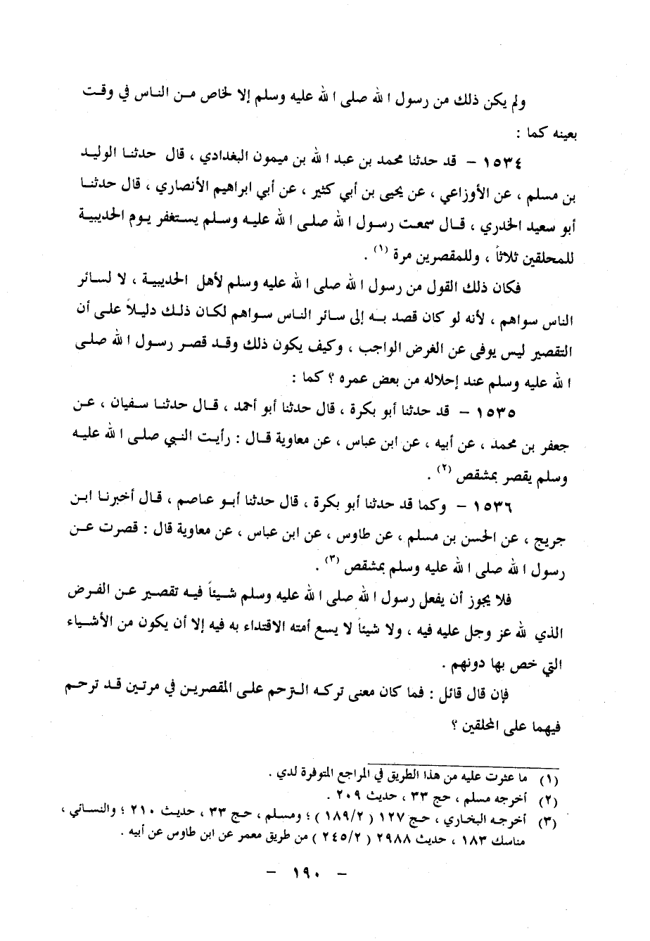 1536 - فَلَا يَجُوزُ أَنْ يَفْعَلَ رَسُولُ اللهِ صَلَّى اللَّهُ عَلَيْهِ وَسَلَّمَ شَيْئًا فِيهِ تَقْصِيرٌ عَنِ الْفَرْضِ الَّذِي لِلَّهِ عَزَّ وَجَلَّ عَلَيْهِ فِيهِ، وَلَا شَيْئًا لَا يَسَعُ أُمَّتُهُ الِاقْتِدَاءُ بِهِ فِيهِ إِلَّا أَنْ يَكُونَ مِنَ الْأَشْيَاءِ الَّتِي خُصَّ بِهَا دُونَهُمْ فَإِنْ قَالَ قَائِلٌ: فَمَا كَانَ مَعْنَى تَرْكِهِ التَّرَحُّمَ عَلَى الْمُقَصِّرِينَ فِي مَرَّتَيْنِ قَدْ تَرَحَّمَ فِيهِمَا عَلَى الْمُحَلِّقِينَ؟