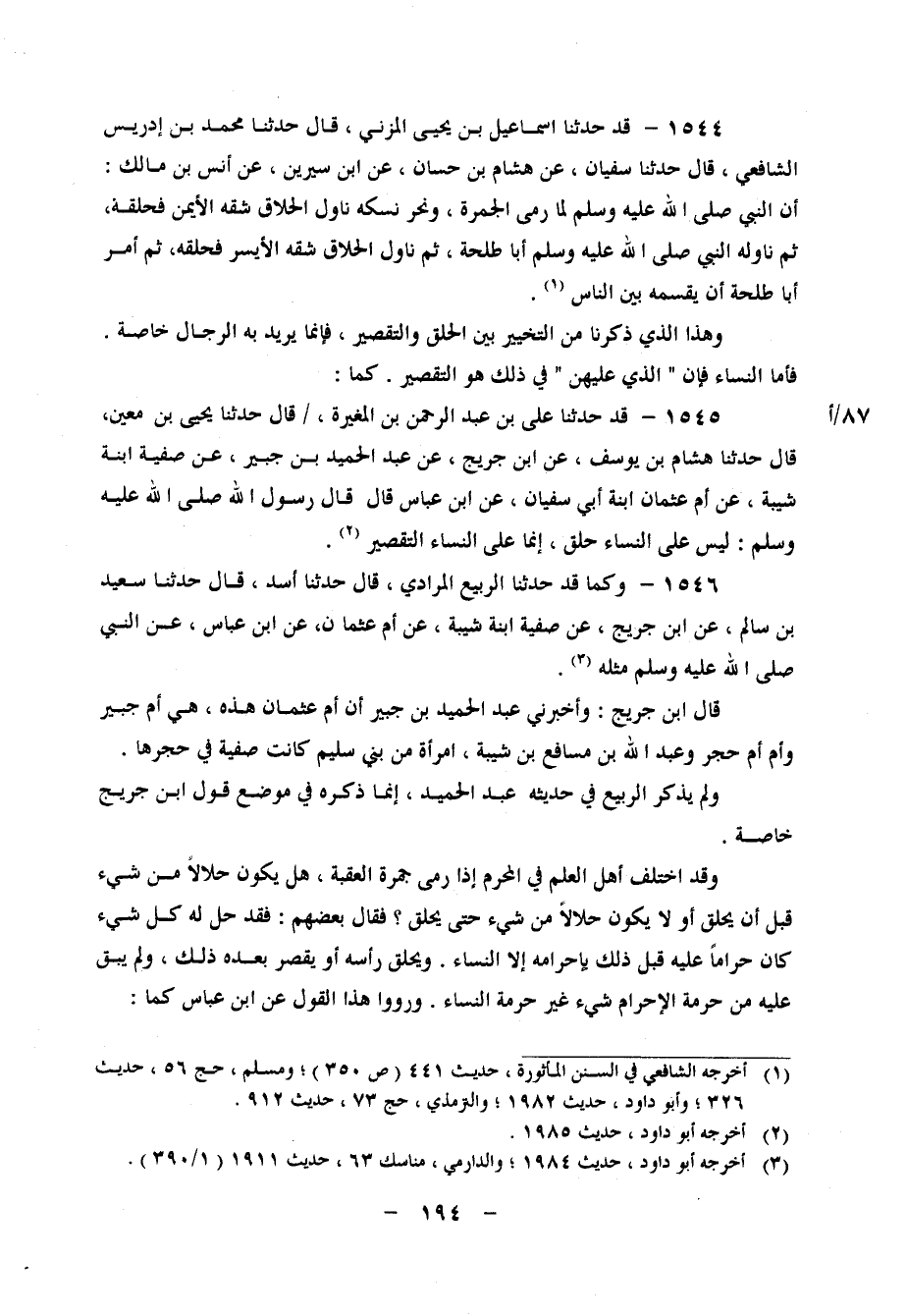 1544 - قَدْ حَدَّثَنَا إِسْمَاعِيلُ بْنُ يَحْيَى الْمُزَنِيُّ، قَالَ: حَدَّثَنَا مُحَمَّدُ بْنُ إِدْرِيسَ الشَّافِعِيُّ، قَالَ: حَدَّثَنَا سُفْيَانُ، عَنْ هِشَامِ بْنِ حَسَّانٍ، عَنِ ابْنِ سِيرِينَ، عَنْ أَنَسِ بْنِ مَالِكٍ، " أَنَّ النَّبِيَّ صَلَّى اللَّهُ عَلَيْهِ وَسَلَّمَ لَمَّا رَمَى الْجَمْرَةَ، وَنَحَرَ نُسُكَهُ، نَاوَلَ الْحَلَّاقَ شِقَّهُ الْأَيْمَنَ، فَحَلَقَهُ، ثُمَّ نَاوَلَهُ النَّبِيُّ صَلَّى اللَّهُ عَلَيْهِ وَسَلَّمَ أَبَا طَلْحَةَ، ثُمَّ نَاوَلَ الْحَلَّاقَ شِقَّهُ الْأَيْسَرَ، فَحَلَقَهُ، ثُمَّ أَمَرَ أَبَا طَلْحَةَ أَنْ يُقَسِّمَهُ بَيْنَ النَّاسِ " وَهَذَا الَّذِي ذَكَرْنَا مِنَ التَّخْيِيرِ بَيْنَ الْحَلْقِ وَالتَّقْصِيرِ، فَإِنَّمَا يُرِيدُ بِهِ الرِّجَالَ خَاصَّةً فَأَمَّا النِّسَاءُ فَإِنَّ الَّذِي عَلَيْهِنَّ فِي ذَلِكَ هُوَ التَّقْصِيرُ، كَمَا